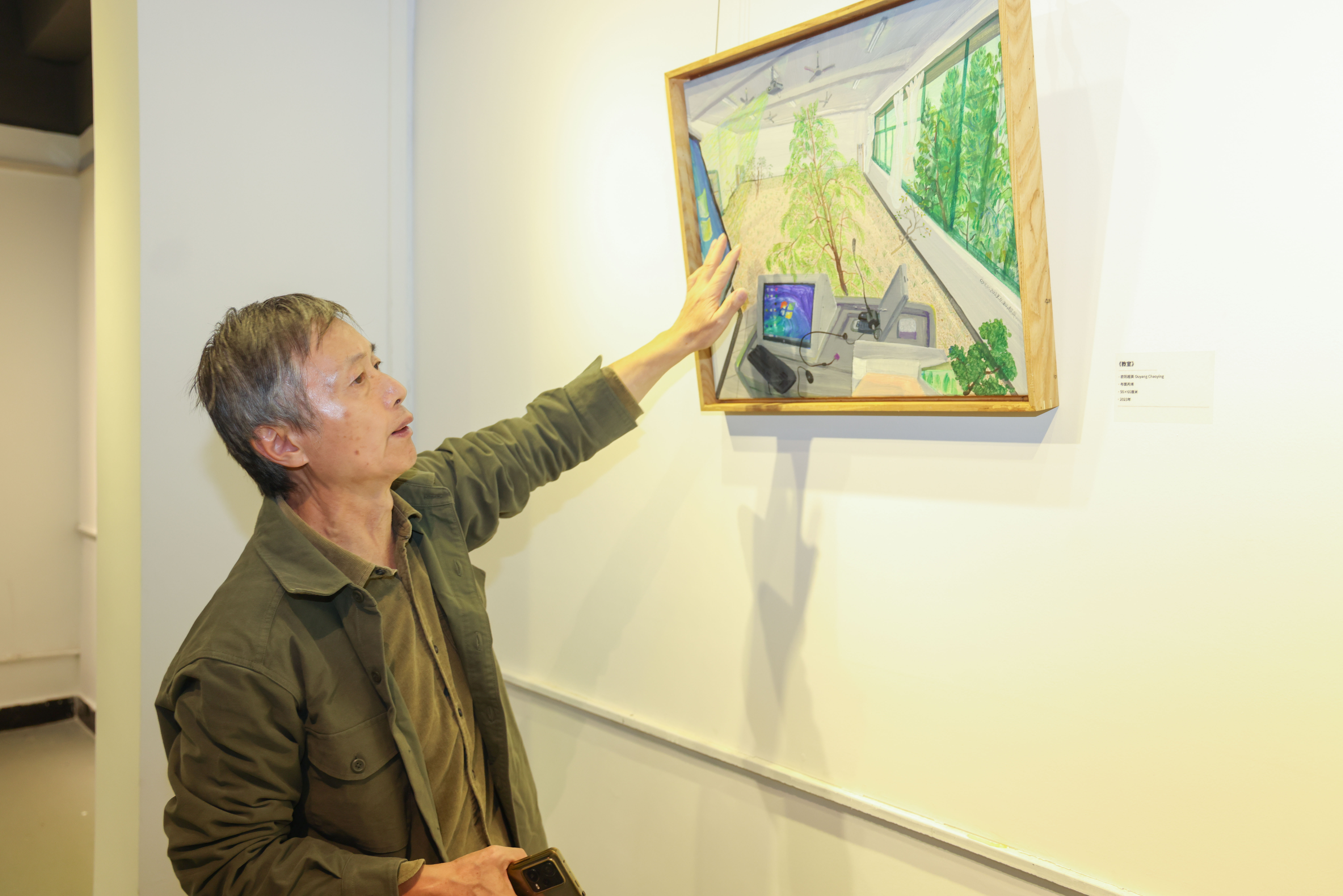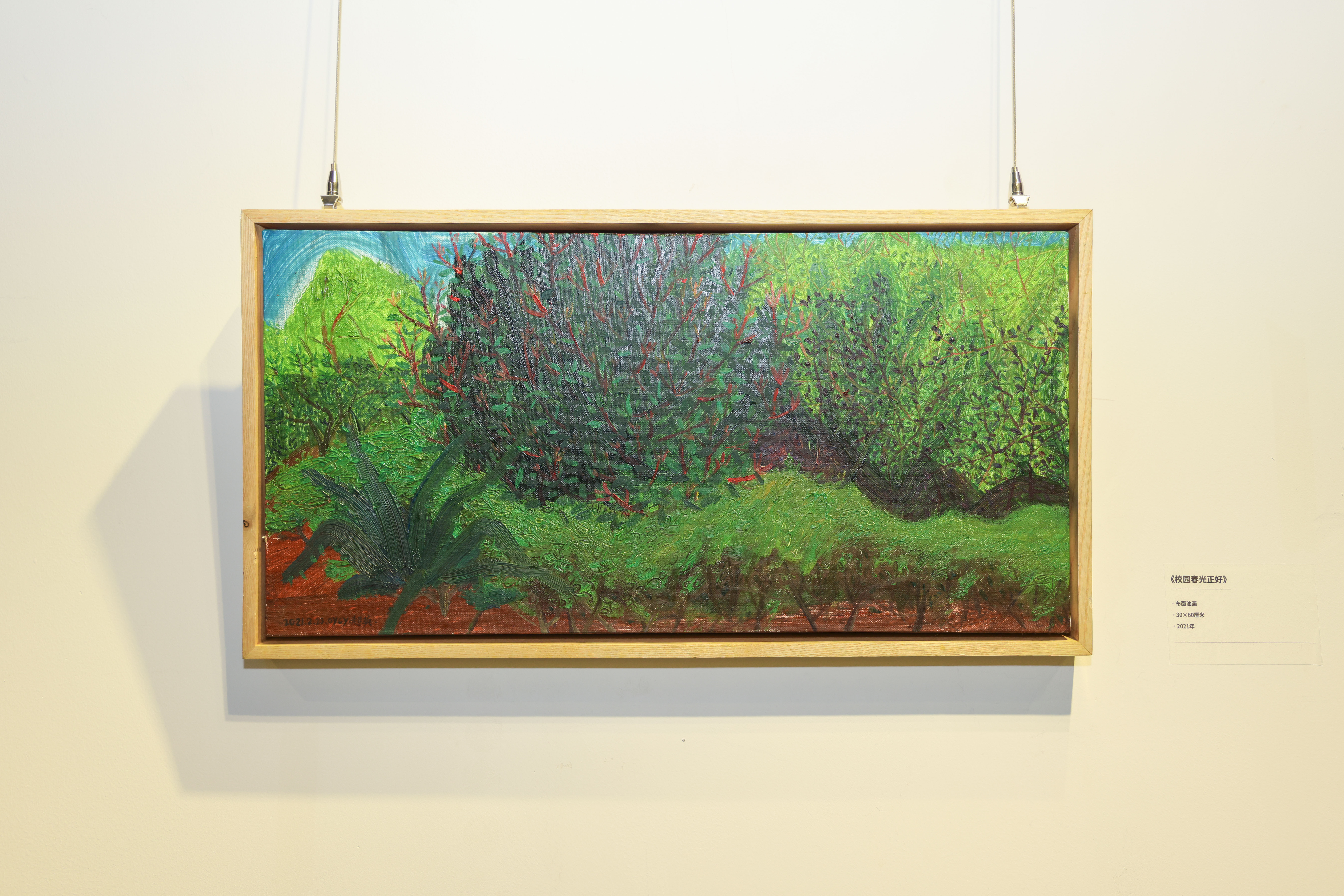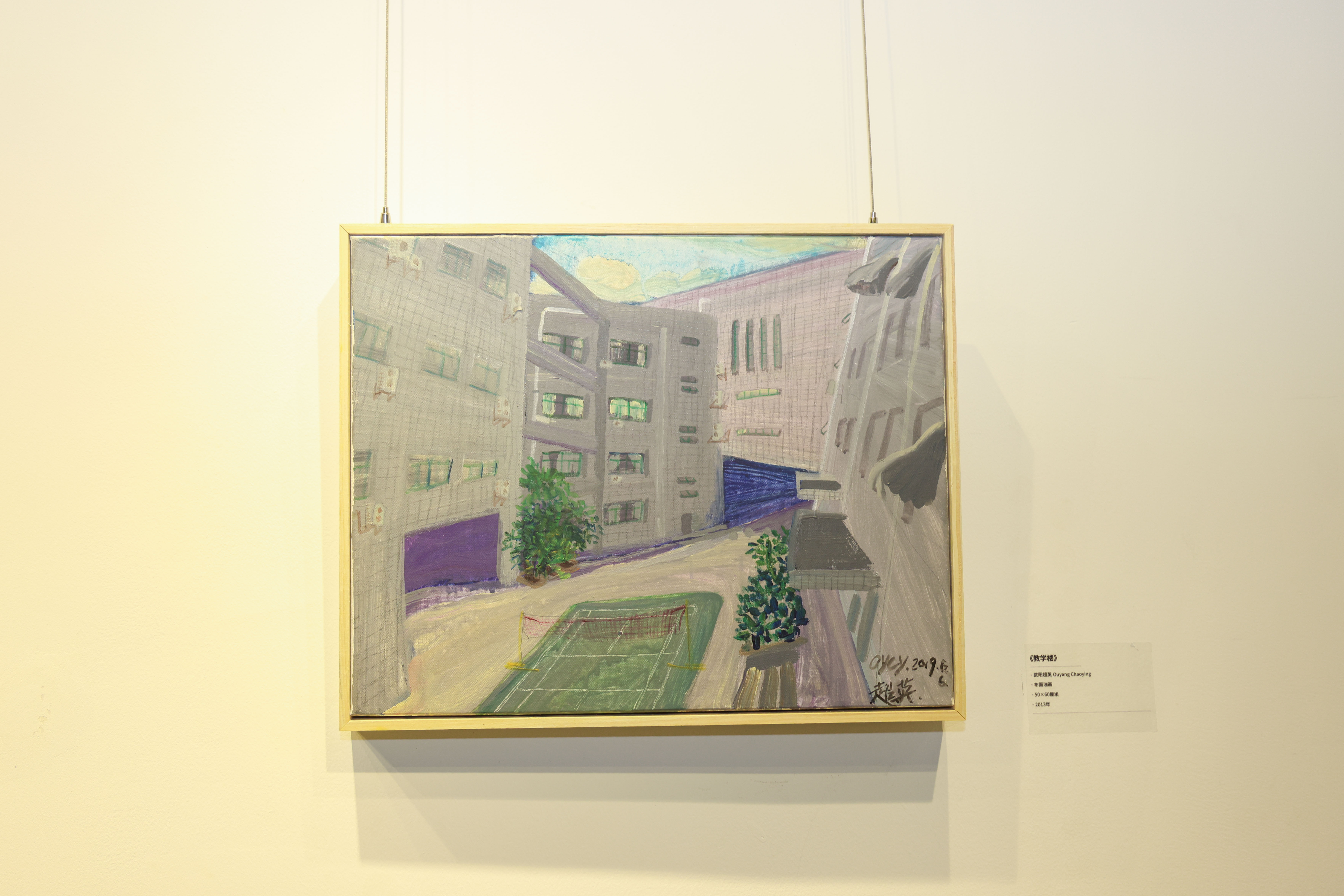 步入展厅,挂在墙上的一幅命名为《七月暑假的校园》的画作映入眼帘。这是由四幅油画拼接而成的校园全景画作,四扇画框形成天然的“窗”,透过“窗棂”,只见楼房幢幢,绿树葱翠。一只小猫匆匆穿过,独享这份假期的宁静。