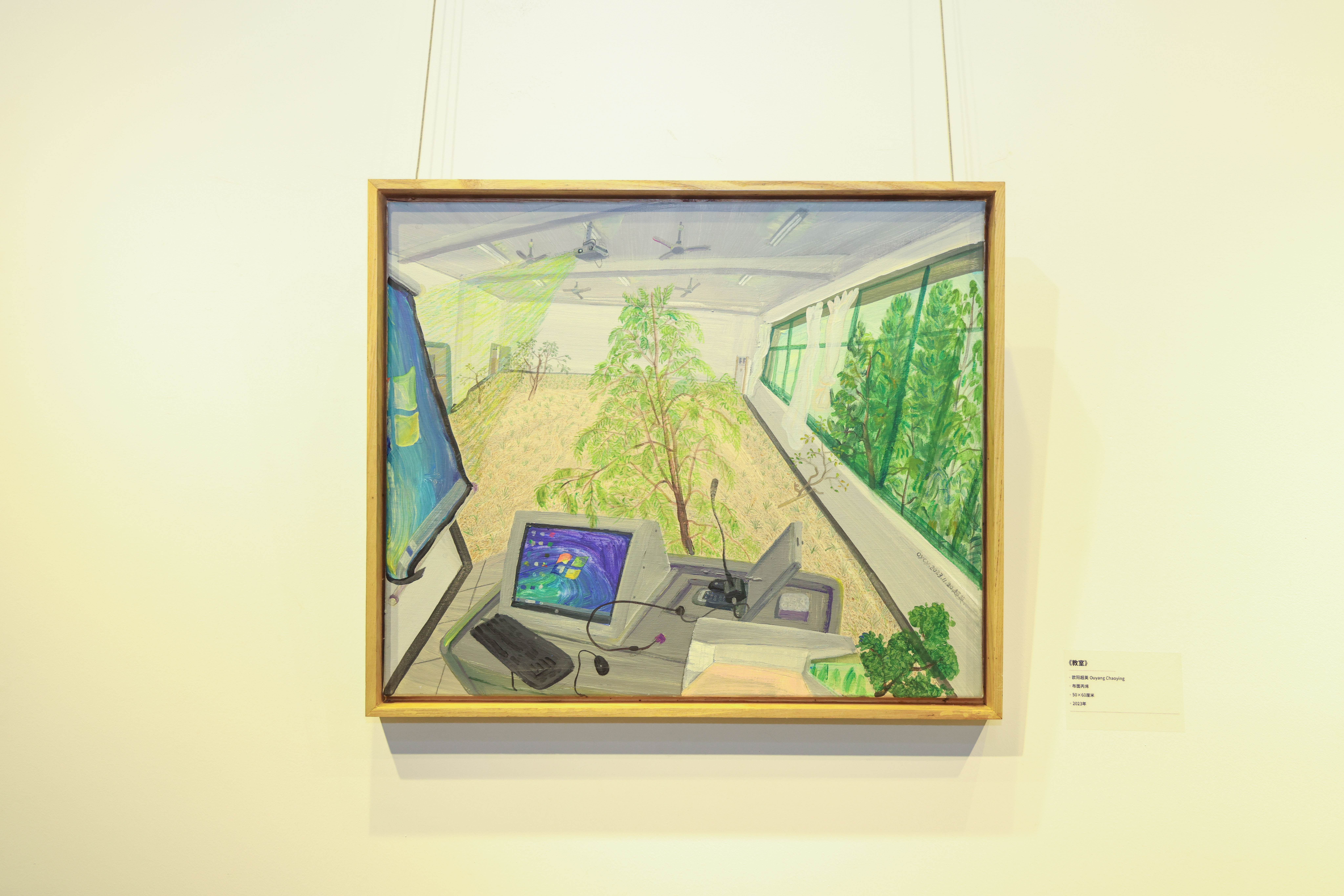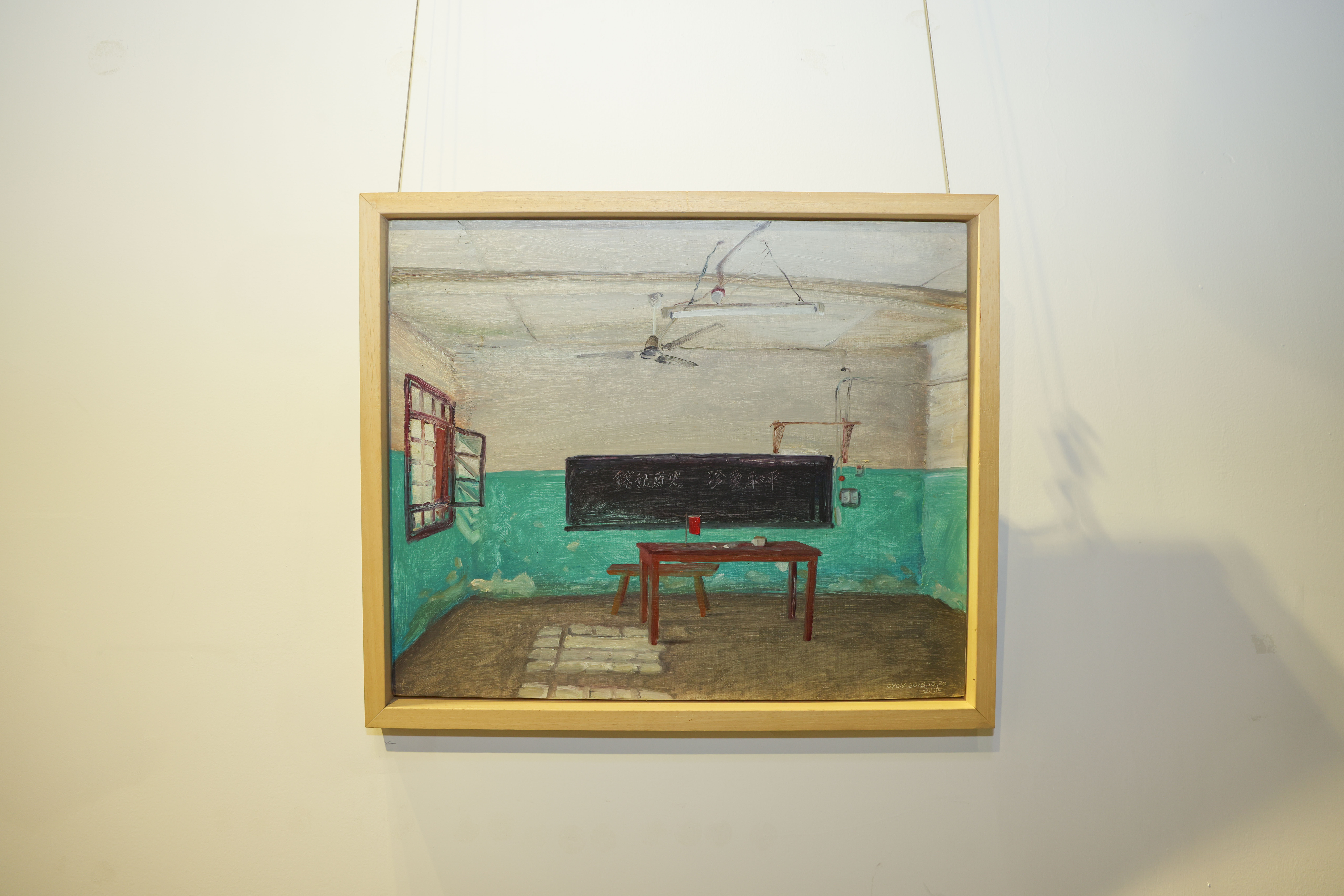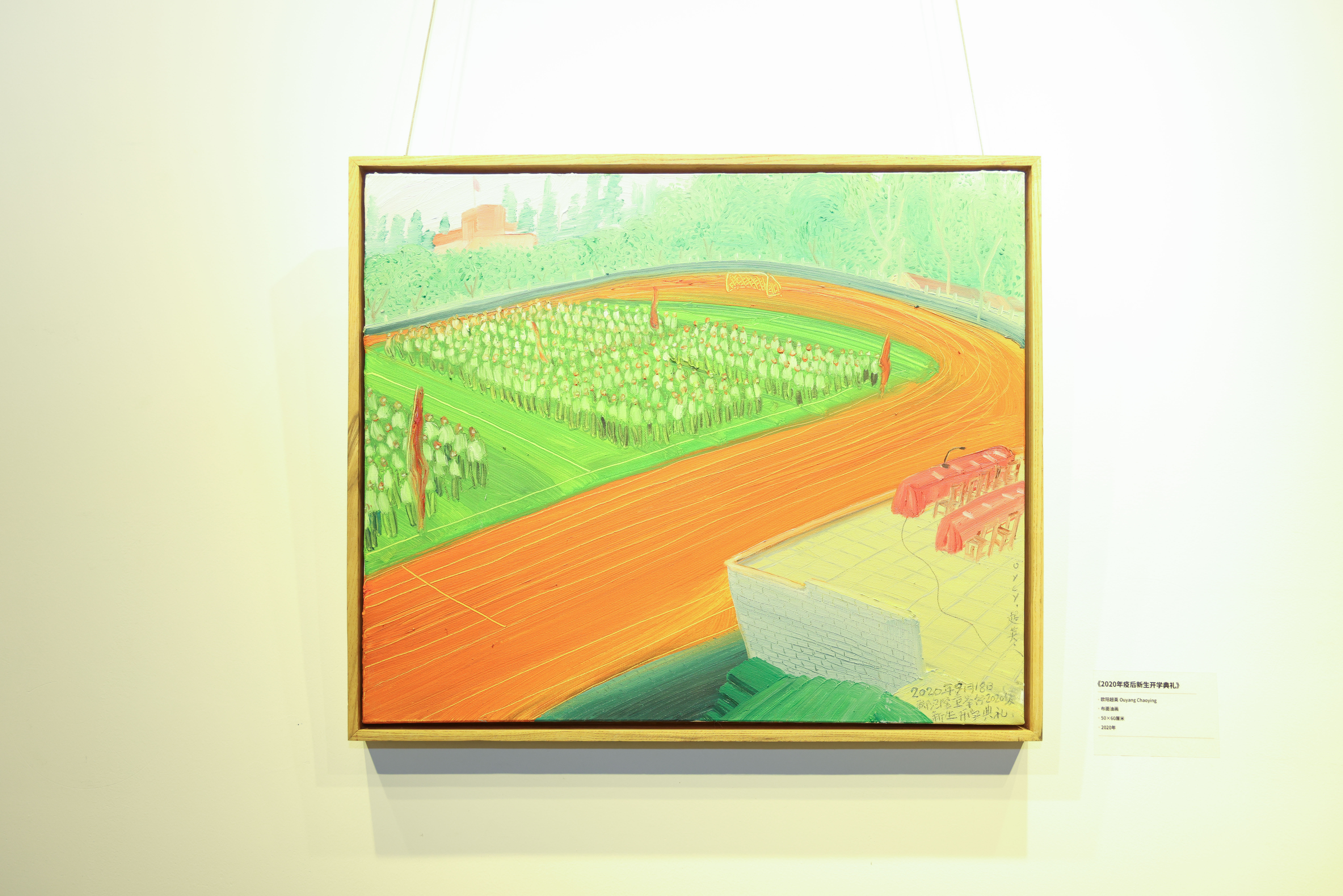 步入展厅,挂在墙上的一幅命名为《七月暑假的校园》的画作映入眼帘。这是由四幅油画拼接而成的校园全景画作,四扇画框形成天然的“窗”,透过“窗棂”,只见楼房幢幢,绿树葱翠。一只小猫匆匆穿过,独享这份假期的宁静。