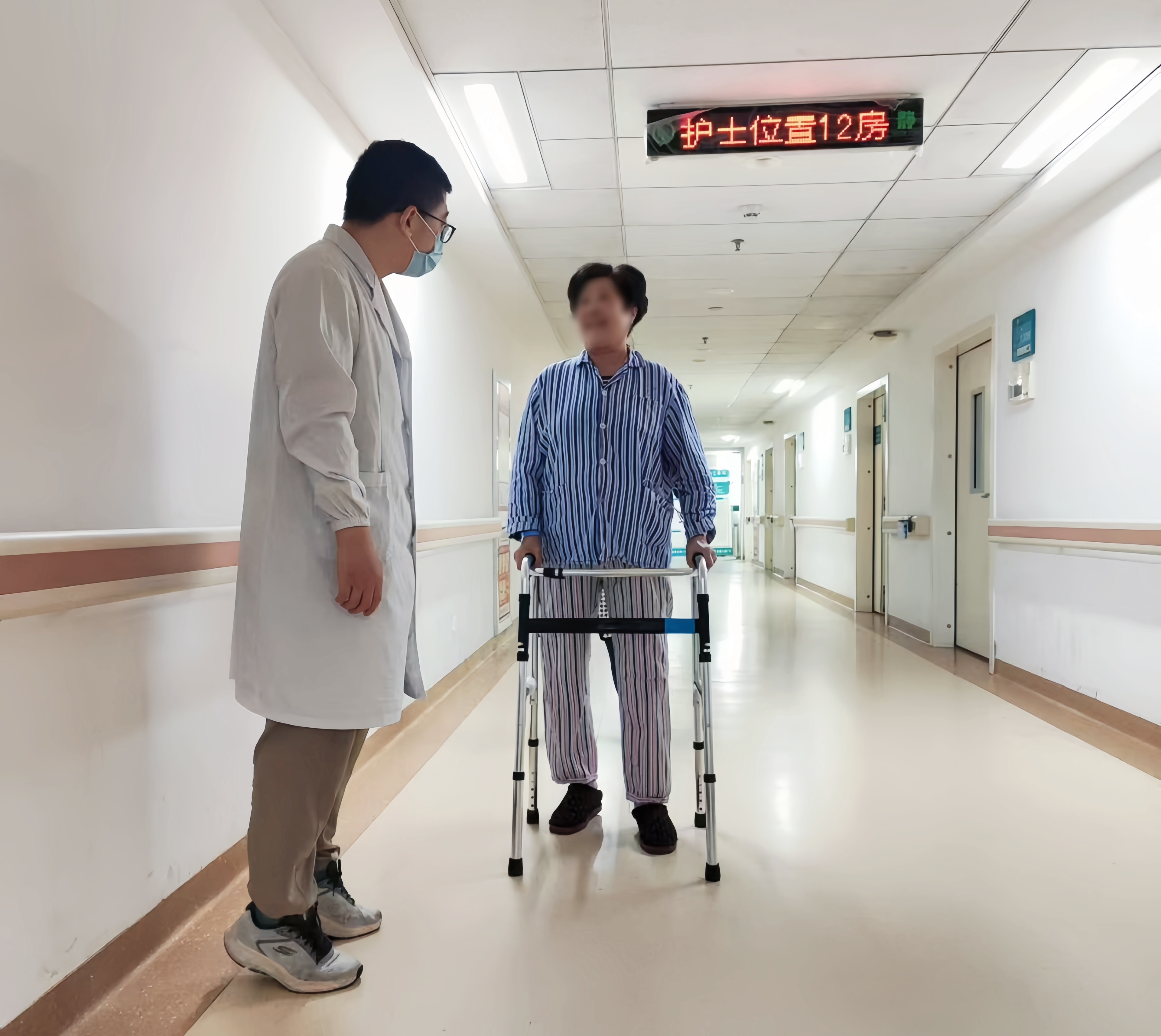 陈奶奶在医务人员的协助下,在病区走廊内尝试行走,进行术后功能康复训练。