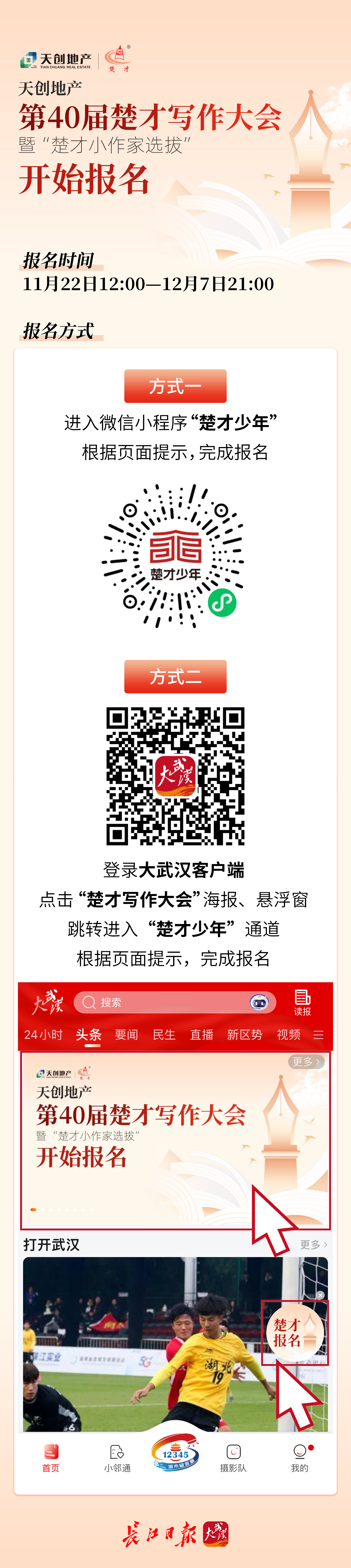 获取参与资格后,通过微信小程序“楚才少年”,以“编码+密码”的方式完成报名。长江日报大武汉客户端也开通了报名通道,可一键直达。