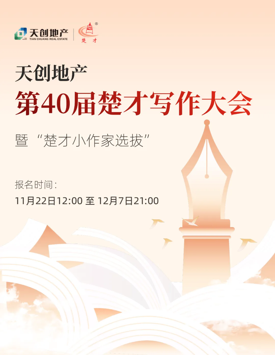 11月22日起,第40届(2024)楚才写作大会暨“楚才小作家选拔”活动开始报名,报名时间为11月22日12:00至12月7日21:00。