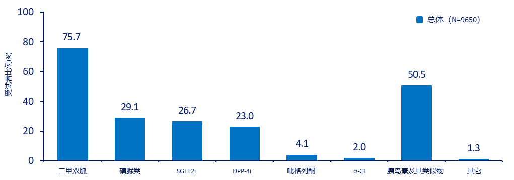 背景降糖药物中,最常用的是二甲双胍(75.7%)和胰岛素/胰岛素类似物(50.5%),其次是磺脲类药物(29.1%)、钠-葡萄糖共转运蛋白-2抑制剂(SGLT2i,26.7%)和二肽基肽酶-4抑制剂(DPP-4i,23.0%)(图2)[1]。