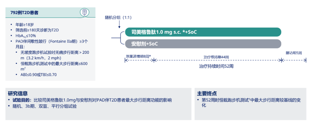 注:*司美格鲁肽注射液从起始剂量0.25mg/周开始剂量递增,每4周剂量加倍,直至达到试验维持剂量1.0mg;†恒定速度和坡度(3.2km/h,12%)跑步机试验。ABI,踝肱指数;PAD,外周动脉疾病;s.c.,皮下注射;SoC,标准治疗;TBI,趾肱指数;T2D,2型糖尿病