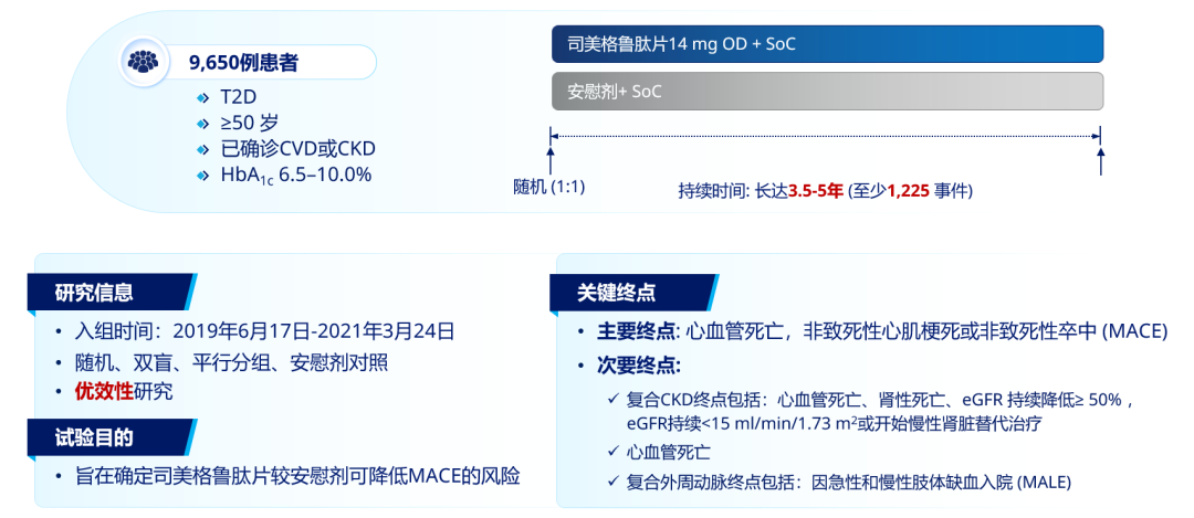 注:CVD,心血管疾病,包括冠脉疾病、脑血管疾病、及症状性外周动脉疾病;CKD,慢性肾脏病,定义为eGFR<60ml/min/1.73m2;HbA1c,糖化血红蛋白;eGFR,估算肾小球滤过率;MACE,主要心血管不良事件;OD,每日一次;SoC,标准治疗(允许除GLP-1RA以外的所有降糖药物);MALE,主要不良肢体事件