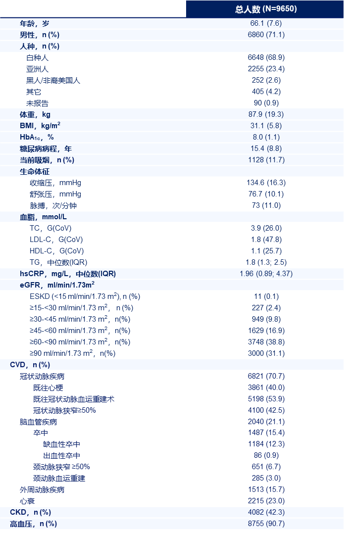 注:除非另有说明,否则数据均为平均值(标准差);BMI,体质指数;HbA1c,糖化血红蛋白;G,几何平均值;CoV,变异系数;IQR,四分位数间距;TC,总胆固醇;LDL-C,低密度脂蛋白胆固醇;HDL-C,高密度脂蛋白胆固醇;TG,甘油三酯;hsCRP,超敏C反应蛋白;eGFR,估算肾小球滤过率;ESKD,终末期肾病;CVD,心血管疾病;CKD,慢性肾脏病,定义为eGFR<60ml/min/1.73m2