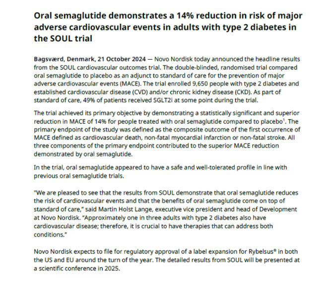 2024年10月21日,SOUL研究关键结果重磅披露[2]:试验结束时,司美格鲁肽片较安慰剂显著降低T2D合并CVD和/或CKD患者的MACE风险达14%,具有统计学显著性和优效性,心血管获益由MACE三个组分(心血管死亡、非致死性心梗或非致死性卒中)降低共同驱动;此外,司美格鲁肽片的安全性和耐受性良好,与既往试验一致。SOUL研究的完整结果预计于2025年发布(图4)。