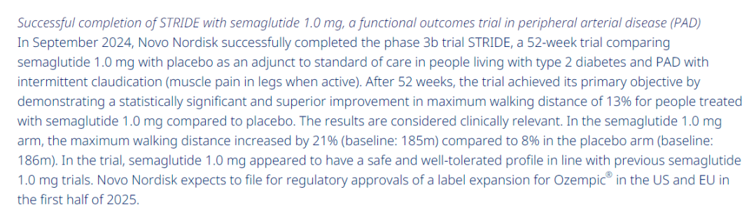 2024年11月6日,STRIDE研究关键结果重磅披露[6]:T2D合并症状性PAD患者中,与安慰剂相比,司美格鲁肽1.0mg治疗52周显著改善患者的MWD达13%(恒定速度3.2km/h,恒定坡度12%),平均MWD增加40米,具有统计学差异和优效性;其中,司美格鲁肽1.0mg组患者的最大步行距离增加21%(基线中位值为185米),而安慰剂组仅增加8%(基线中位值为186米);此外,司美格鲁肽1.0mg的安全性和耐受性良好,与既往试验一致。该研究的完整结果预计于2025年发布(图6)。