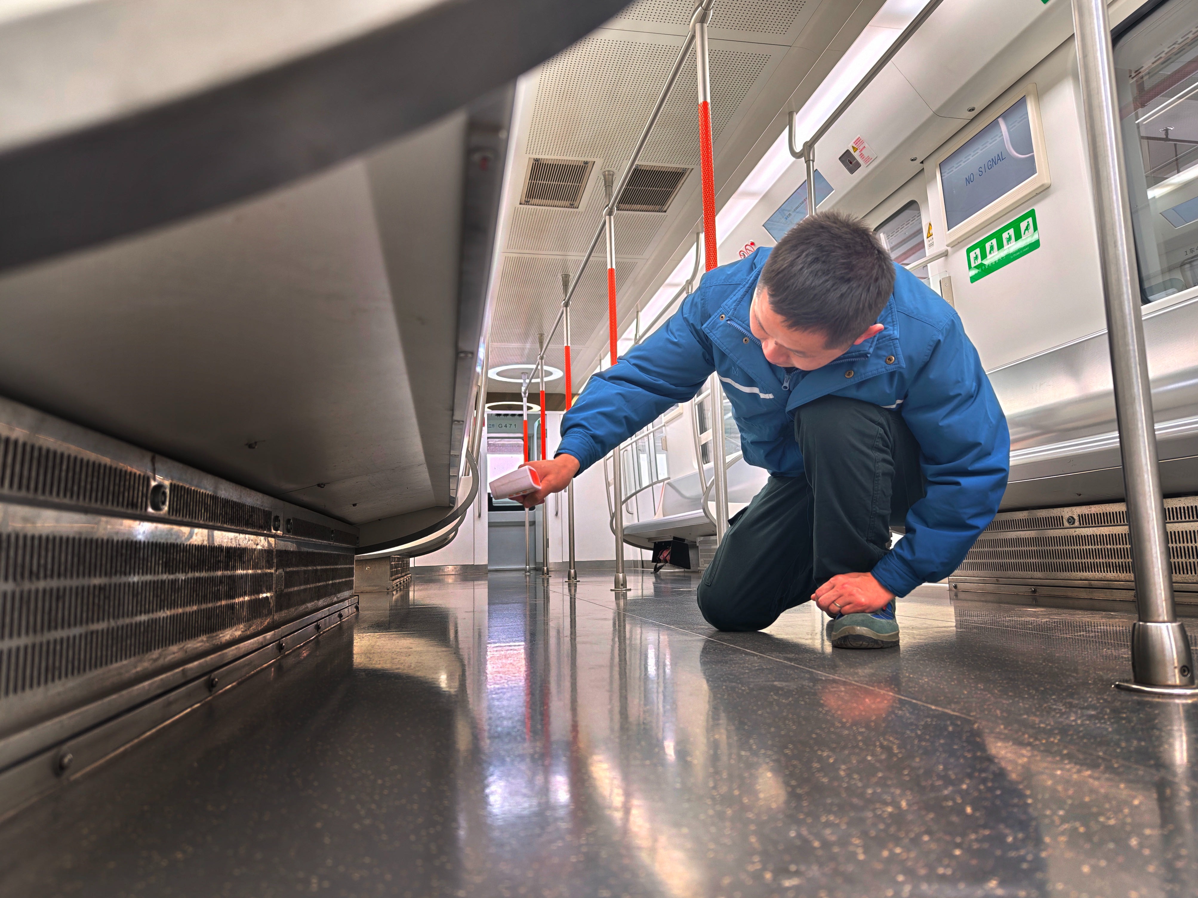 地铁列车检修人员通过点温枪确认座椅下方电暖工作状态。 通讯员方正阳 摄