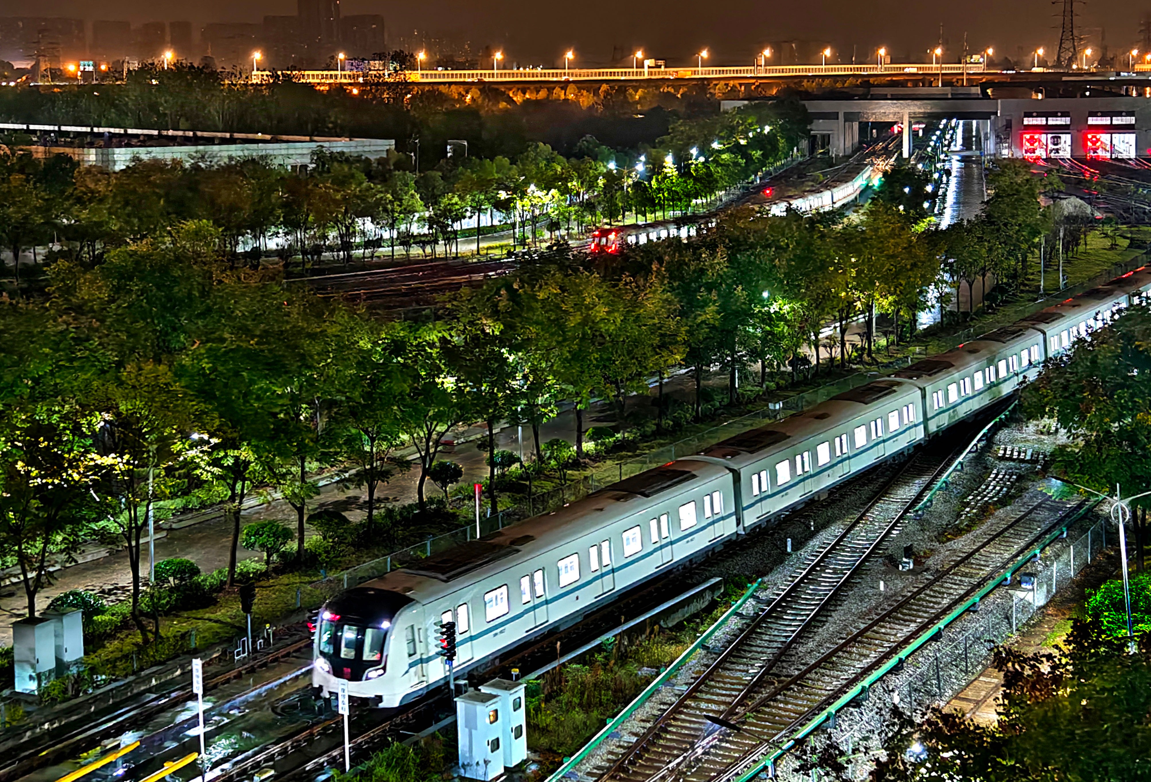 25日清晨,地铁野芷湖车辆段,7、8号线列车冒雨出库进入正线。通讯员方正阳 摄