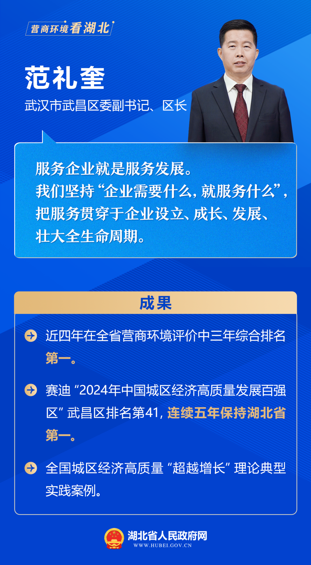 “优越的营商环境不仅让武昌赢得了口碑,更为武昌发展带来了实实在在的变化。”范礼奎谈到通过优化营商环境,近三年武昌区经济规模每年跨越一个百亿台阶,今年将全力冲刺2000亿元大关。同时,他表示,“营商环境不仅仅是经济指标,也是高质量发展的综合体现”。