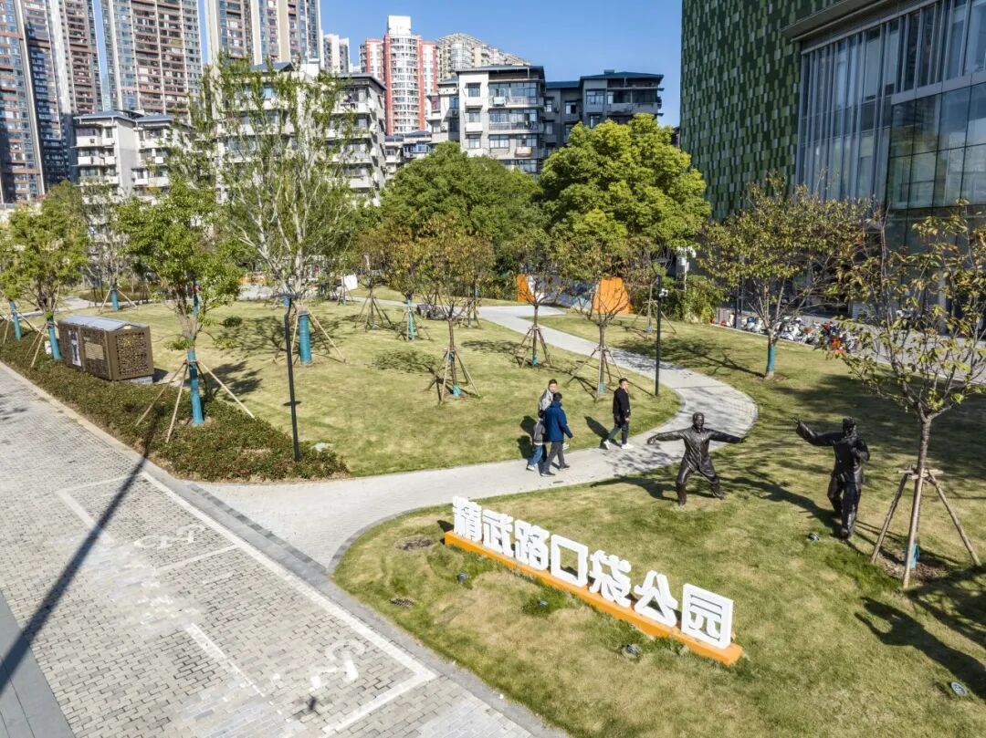 位于精武路与解放大道交会处的精武口袋公园,占地约3300平方米,巧妙地挖掘了精武路历史文化底蕴,并通过文化景墙展现给来往的市民,以往的空置地块变成了集历史文化、休闲娱乐、绿色生态的口袋公园。