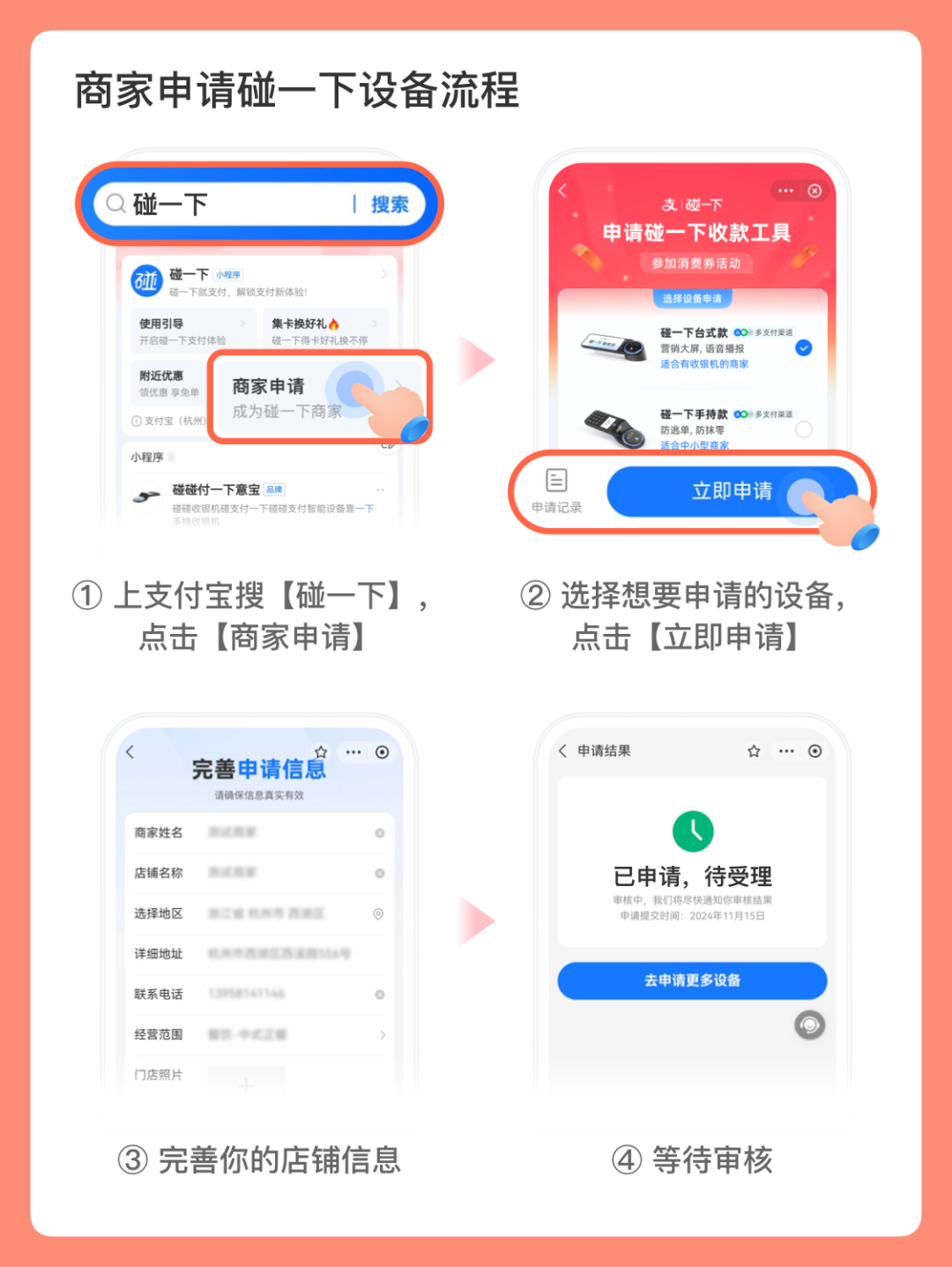 特别提醒:希望参与消费券核销的商家,请尽快报名。报名方式:上支付宝App搜索【碰一下】,点击【商家申请】,提交申请后,将有专人联系商家上门免费安装碰一下收银设备(收银机连接款)、碰一下点餐桌贴。也可按需选择碰一下收银设备(手持款)。