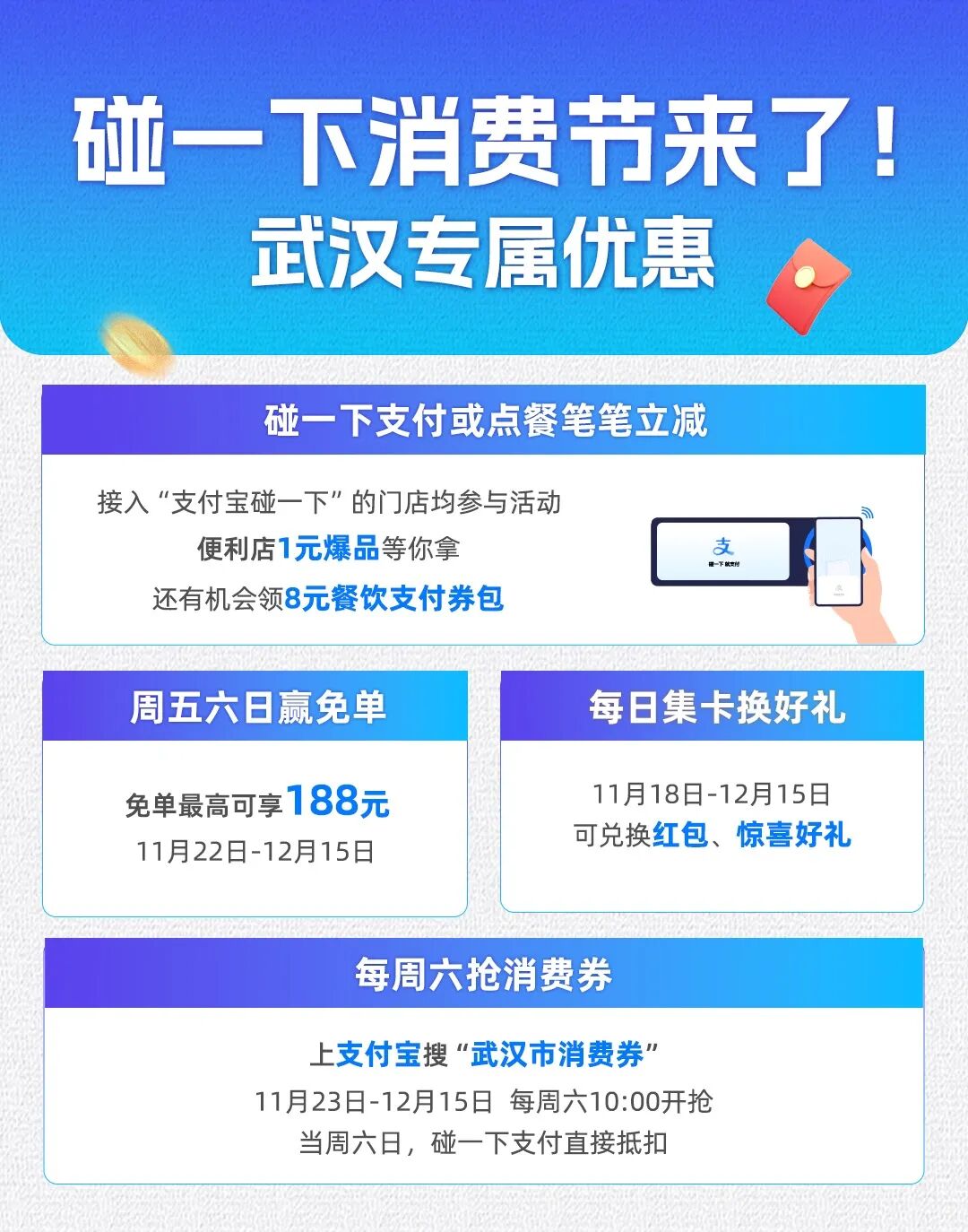 目前,支付宝“碰一下”支付已在湖北省各地上线,“碰一下”第二轮消费券将于11月30日上午10点在武汉市发放,边抢边省,越花越爽。