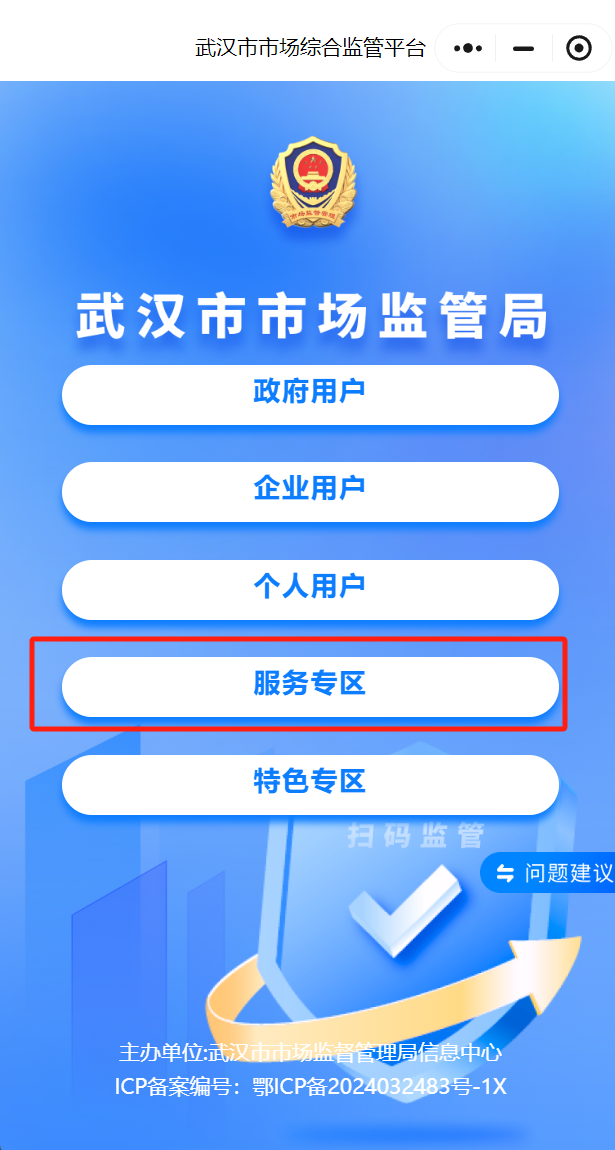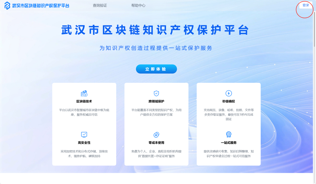 访问平台入口,电脑端访问武汉市市场监督管理局官网(https://scjgj.wuhan.gov.cn/)办事服务专栏武汉市区块链知识产权保护平台,右上角点击登录按钮,跳转平台登录页,新用户根据系统提示跳转到湖北省统一身份认证平台进行注册与登录后,自动跳转到区块链知识产权保护平台。
