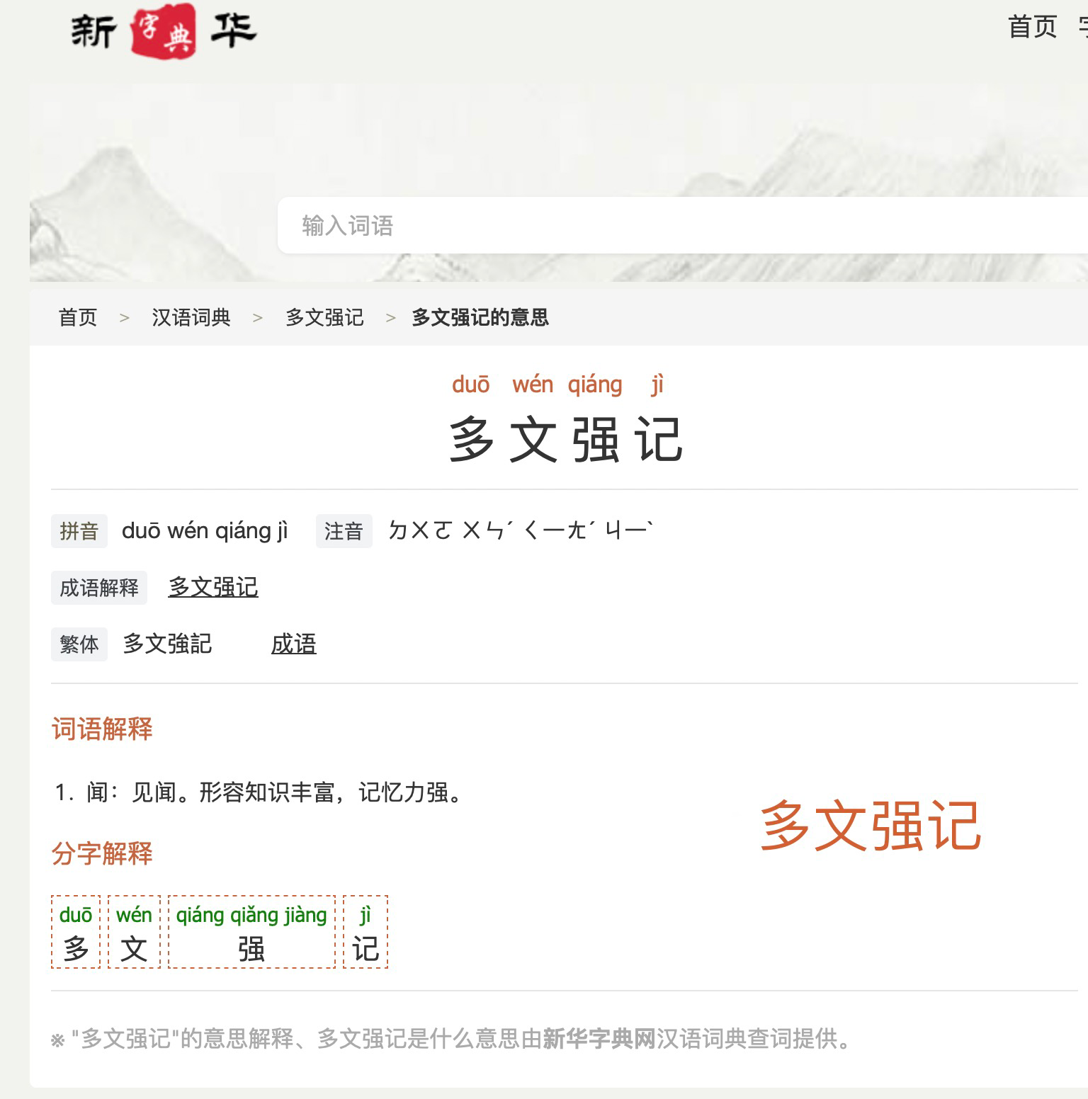 实际上,有大量在线字典网站都收录了“多文强记”一词,而且词语解释、出处等内容都如出一辙。记者查询第七版《现代汉语词典》发现,与“多文强记”相似的成语为博闻强识与博闻强记,但都是见闻的“闻”。