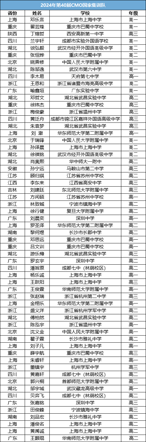 据统计,在进入国家集训队名单的60人中,上海以12人高居榜首,湖北9人紧随其后,浙江8人位列第三。广东、四川和重庆各有6人入选,北京4人,湖南3人,江苏2人,而安徽、吉林、江西和陕西则各有1名优秀学子入选国家集训队。