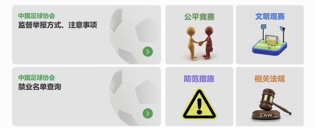 近期,中国足协官网刚刚上线了“禁业名单查询”,只要是被中国足协课以禁足处罚者,都能查到详细的信息。具体说来,点开中国足协官网,进入“监督举报”板块,随后页面就会显示“足球诚信和公平竞赛”序言,以及包括“监督举报方式、注意事项”“禁业名单查询”在内的6个选项。