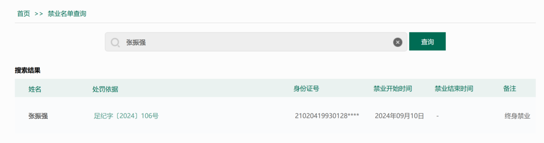 中国足协官网近期刚上线"禁业名单查询"