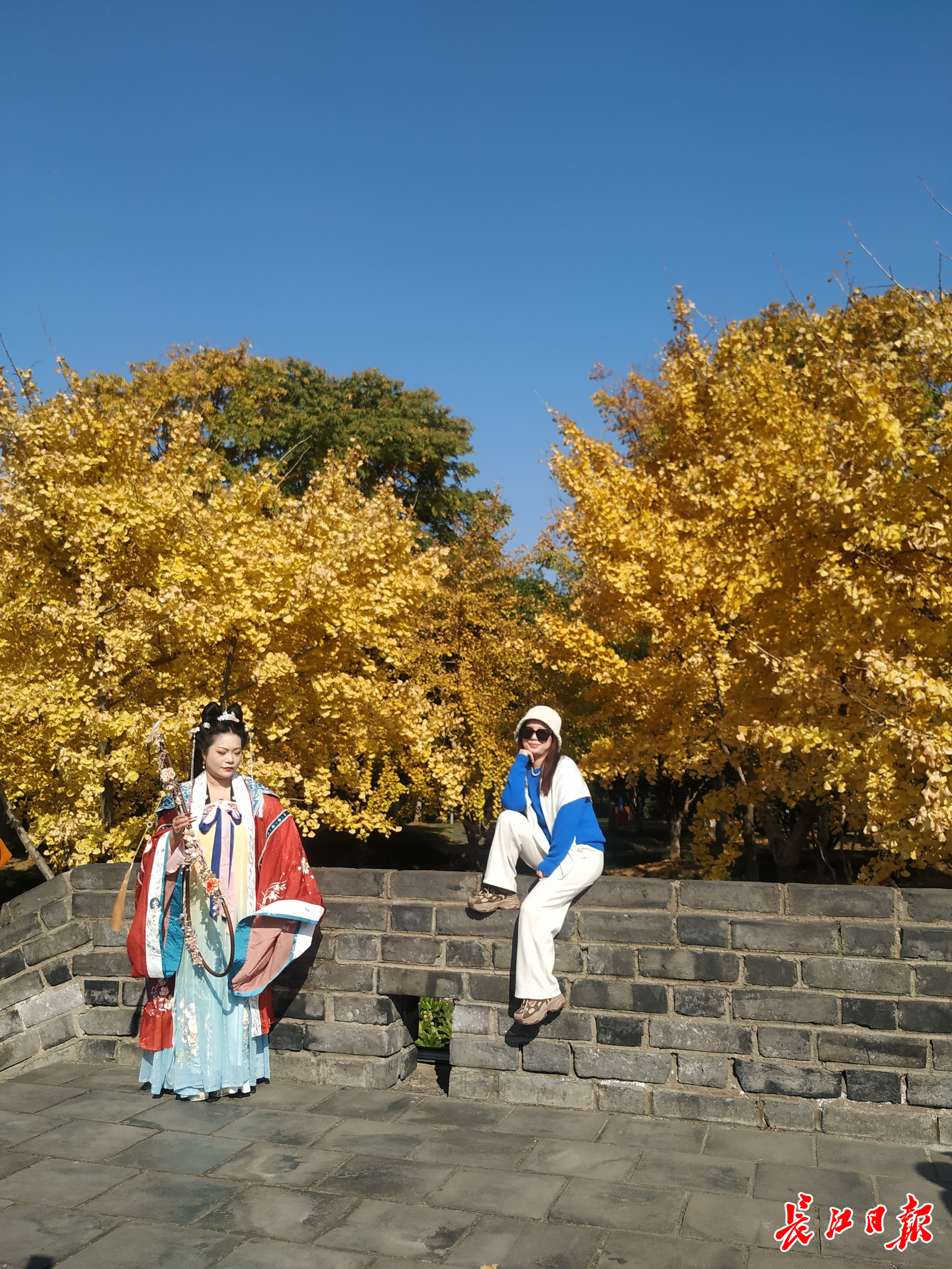 晴天里,金黄的银杏闪着金光,不少市民和游客带着浅色外套、裙子及各种围巾、帽子等物品在此与城墙、银杏拍照,氛围感拉满。还有不少女生化着精致的妆容,身着汉服来约拍,古风十足,易出片。