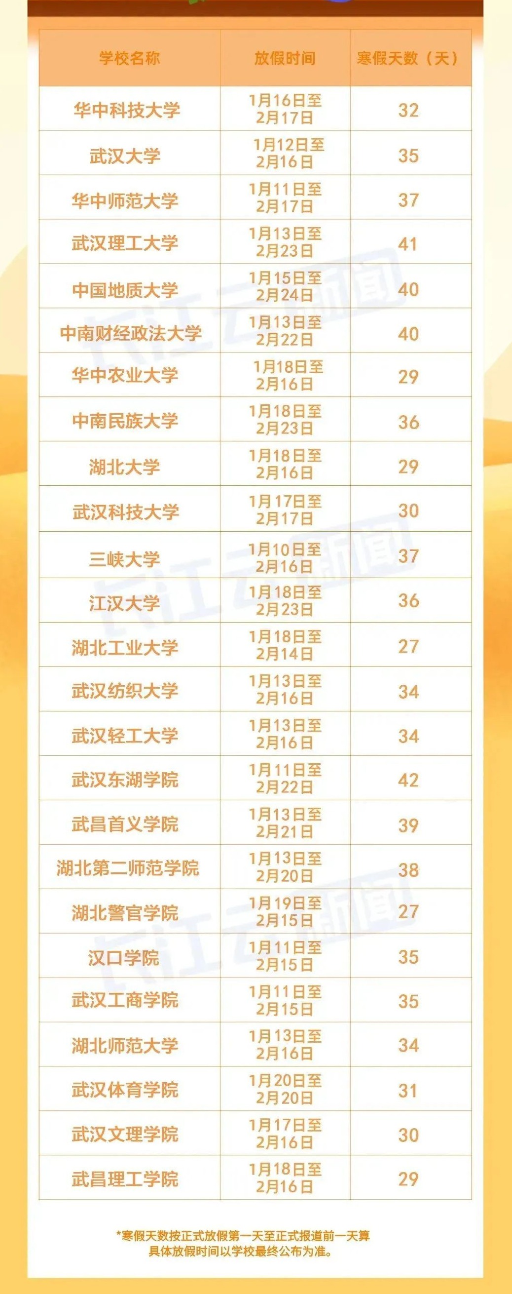 此前,湖北多所高校公布了寒假时间,武汉大多数院校都集中在2025年1月10日—20日开始放寒假,与往年差别不大。
