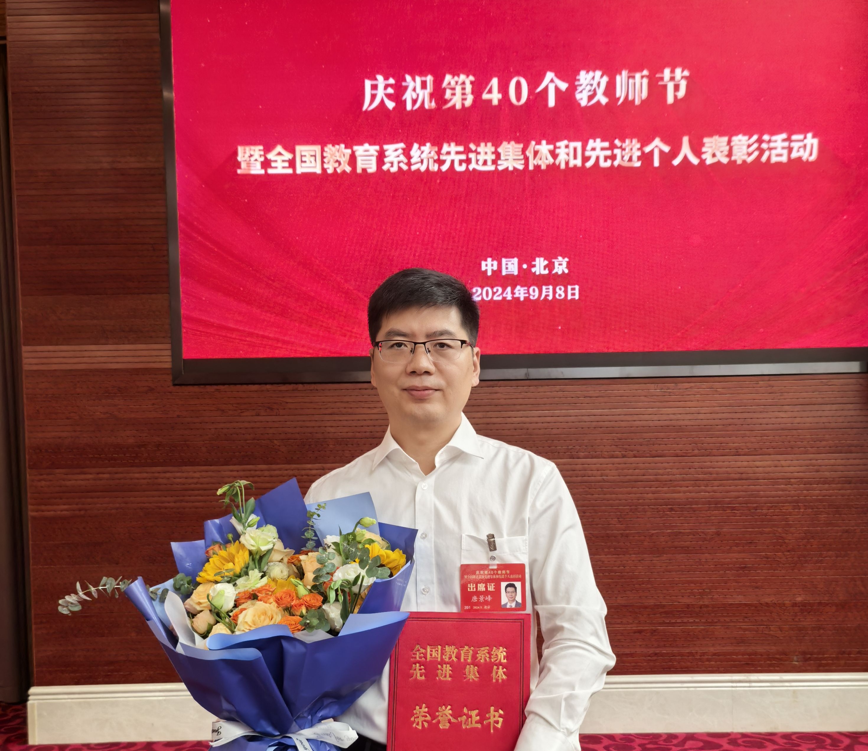 湖北工业大学生命科学与健康工程学院获评2024年“全国教育系统先进集体”称号,唐景峰前往北京参加教师节表彰。