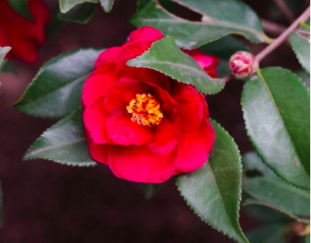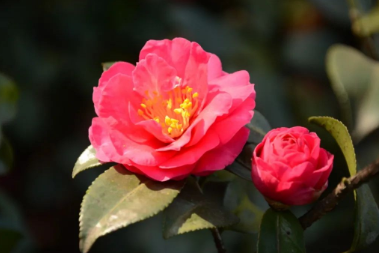 笑颜则是春茶梅品种群的代表之一,花色多为红色或粉红色,花瓣半重瓣型,花径较大;树形大小、高低介于茶梅与山茶之间,叶片也相对较大。花期从12月至翌年4月,是春季重要的观赏花卉。