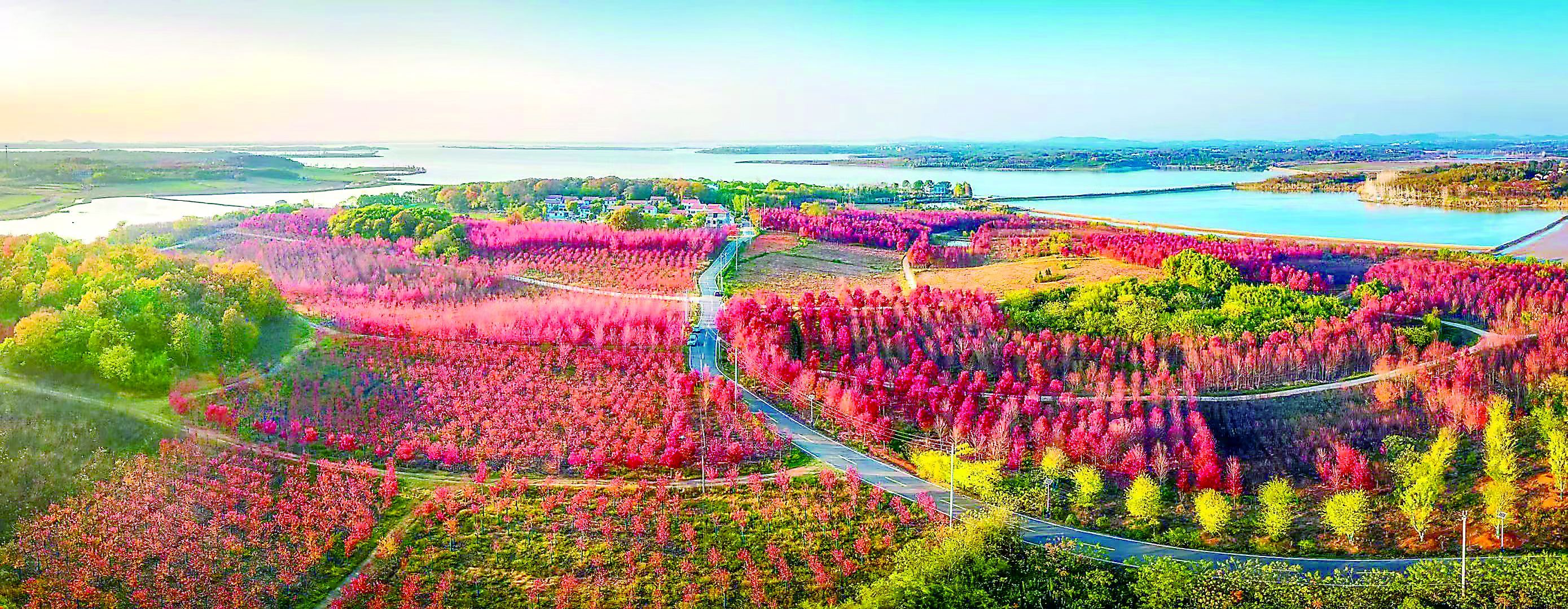 江夏区安山街道青春村以环鲁湖EOD项目建设为契机,打造一湾一景观光旅游经济带,图为江夏区安山街道青春村郭家湾的红枫林。