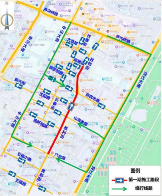 2024年12月13日至2025年9月30日,胜利街(六合路至旅顺路)实行机动车由南向北(六合路往旅顺路方向)单向通行,北往南方向需通行施工路段的机动车可绕行中山大道、张自忠路、六合路、芦沟桥路、沿江大道、山海关路等周边道路。