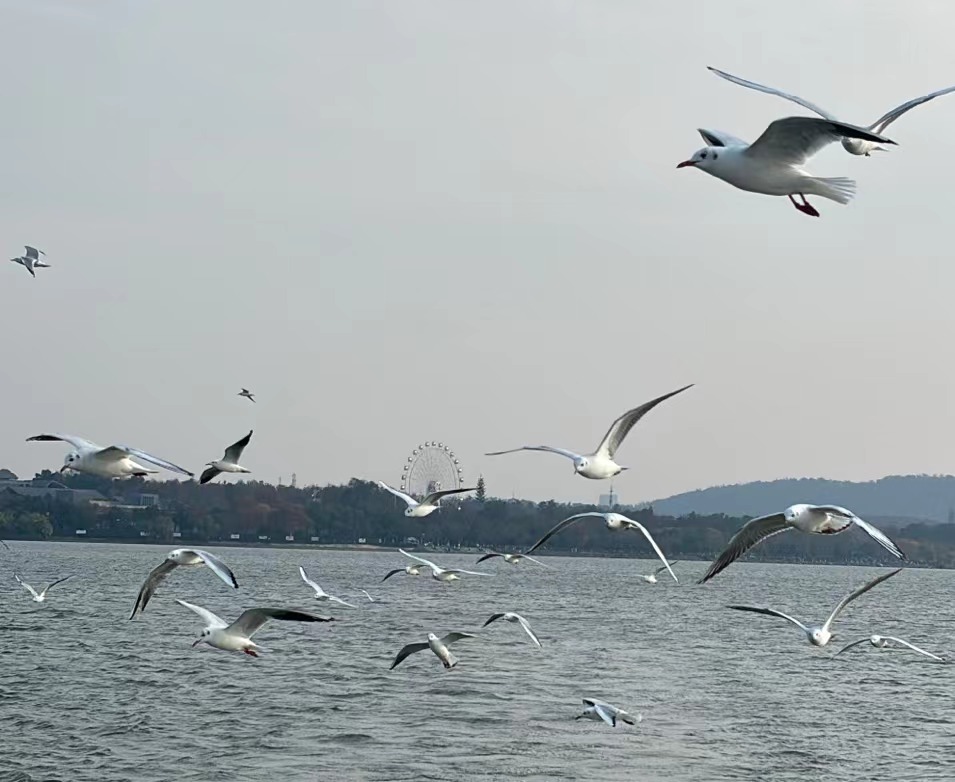 “太美了!漂亮的红嘴鸥好像海鸥,在辽阔的湖面与人同欢,离我们这么近,体验超值!”游客黄鑫一边拍照一边感叹,“之前都是在网上看到国外海鸥在海上飞翔,居然在城市里也能遇见这样的场景,东湖果然是一片‘海’!”游客洪斌则表示,眼前有山、有水、有鸥、有景,远处的磨山楚天台、东湖之眼古今相映,身旁的东湖绿道游人欢笑,身在武汉实在太幸福了。