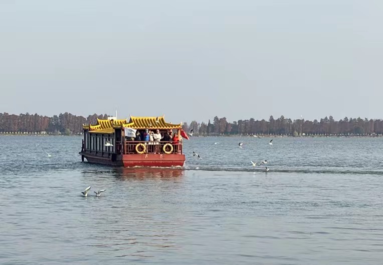 红嘴鸥跟随东湖游船纷飞。 钟珊 摄