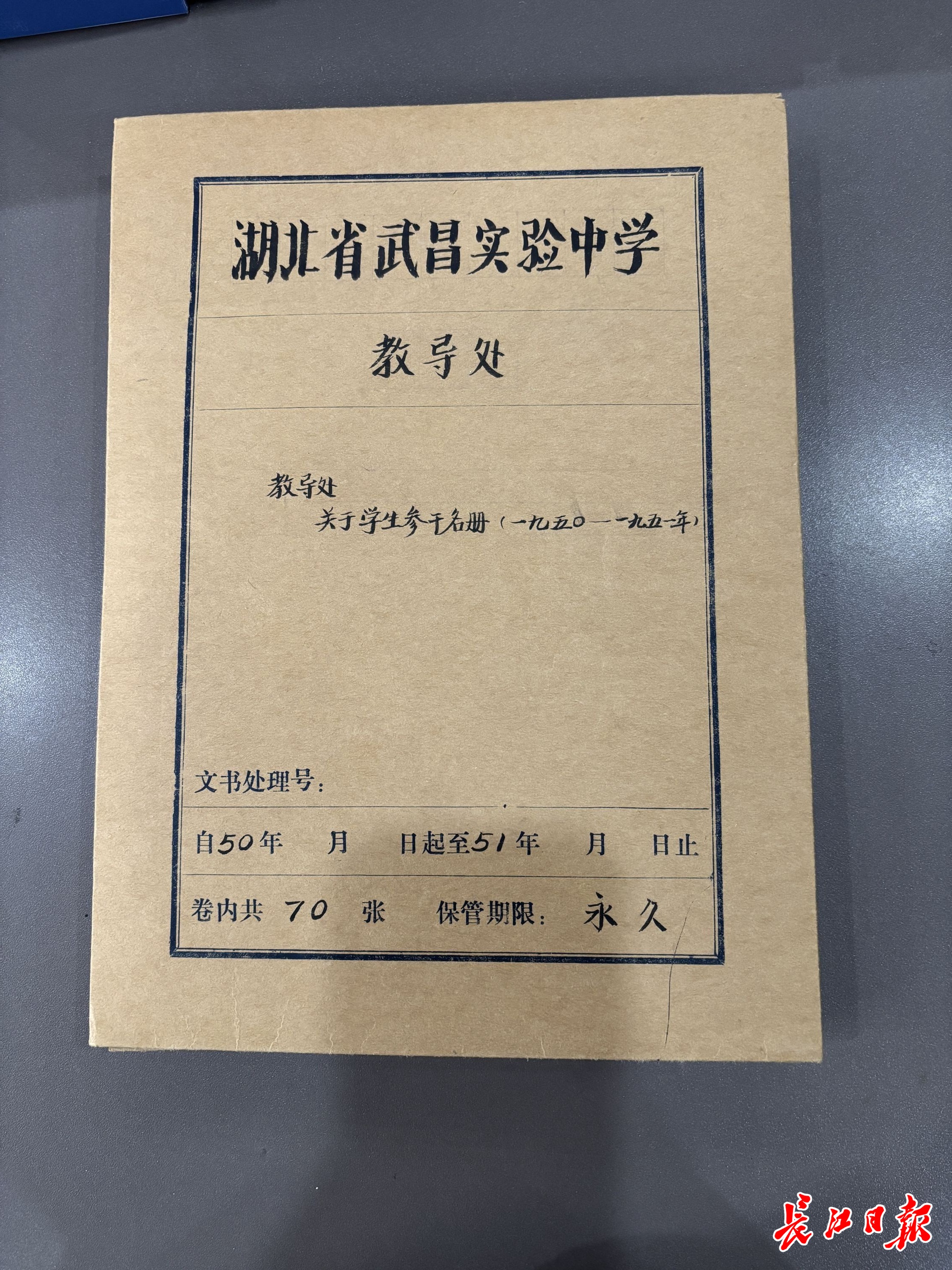 图为湖北省武昌实验中学的一份档案封面。(一九五〇——一九五一年)。记者耿珊珊摄