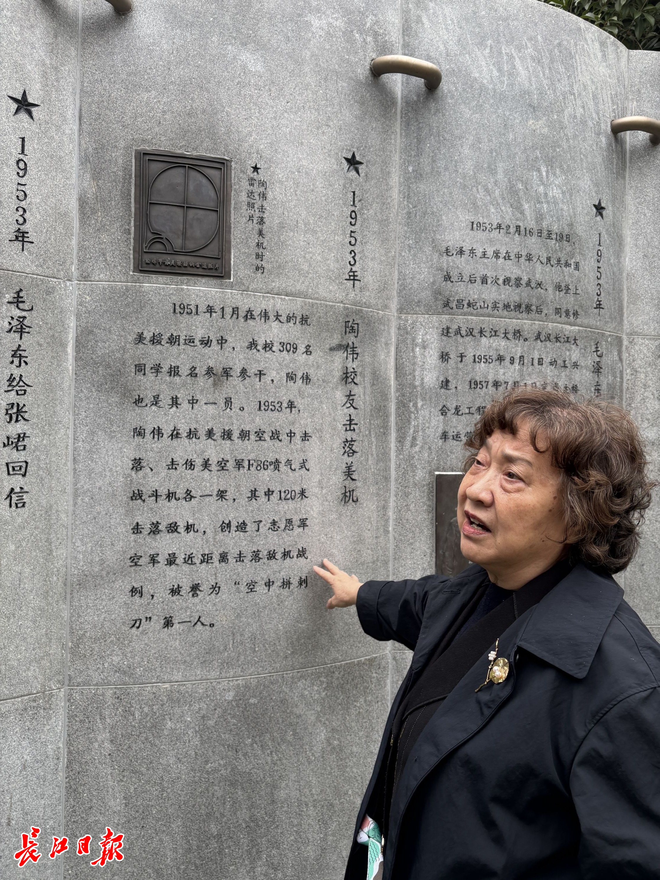 2020年11月14日,86岁的抗美援朝老兵陶伟回到了阔别多年的母校,为校园内的“抗美援朝”浮雕纪念墙揭幕。此后几年,陶伟老人接受媒体采访,讲述他与敌人“空中拼刺刀”故事时,不忘提起这面纪念墙和309位参军参干战友。