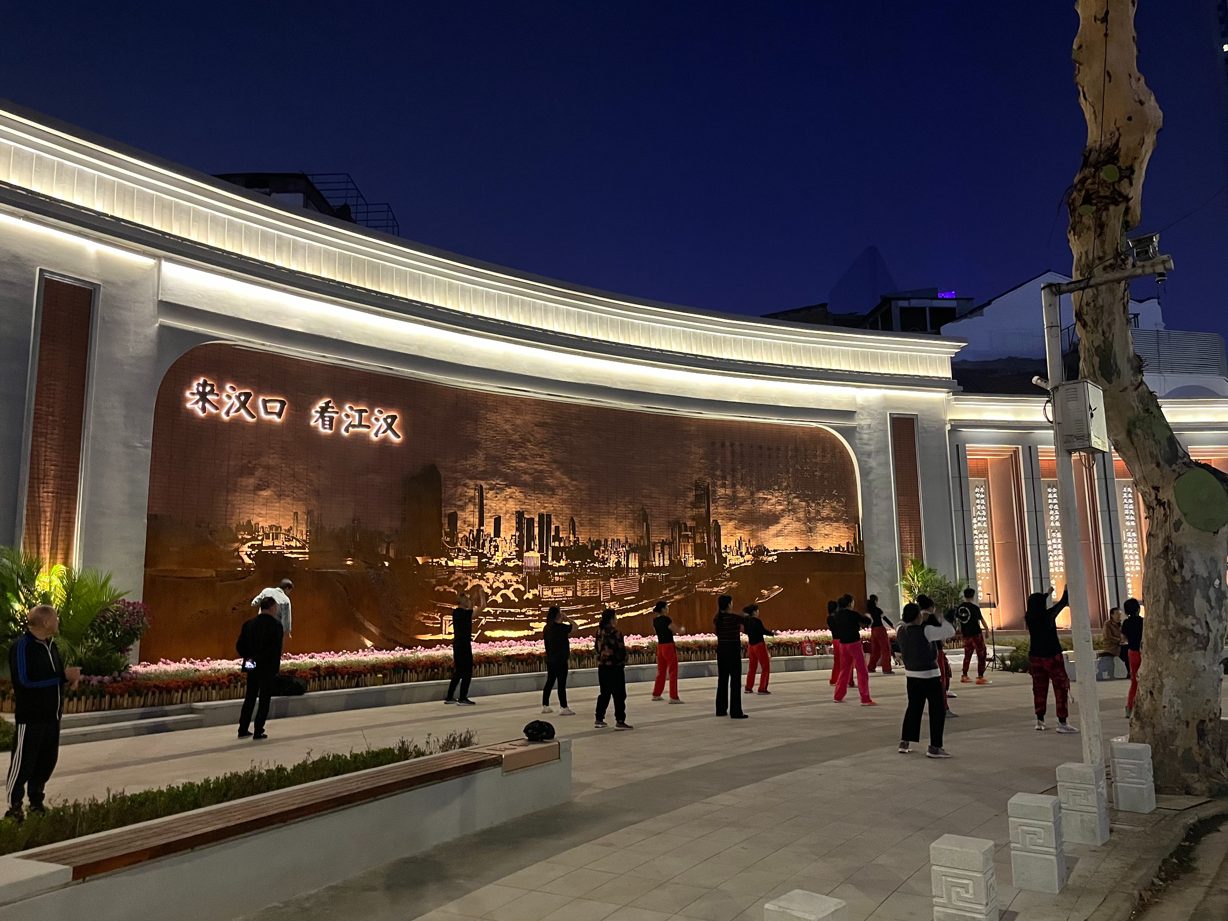 现在,白天这里吸引众多新老武汉人来拍照打卡。到了夜晚,亮化和改造后的铜人像中心广场则成了周边居民休闲交流和跳广场舞的新空间。