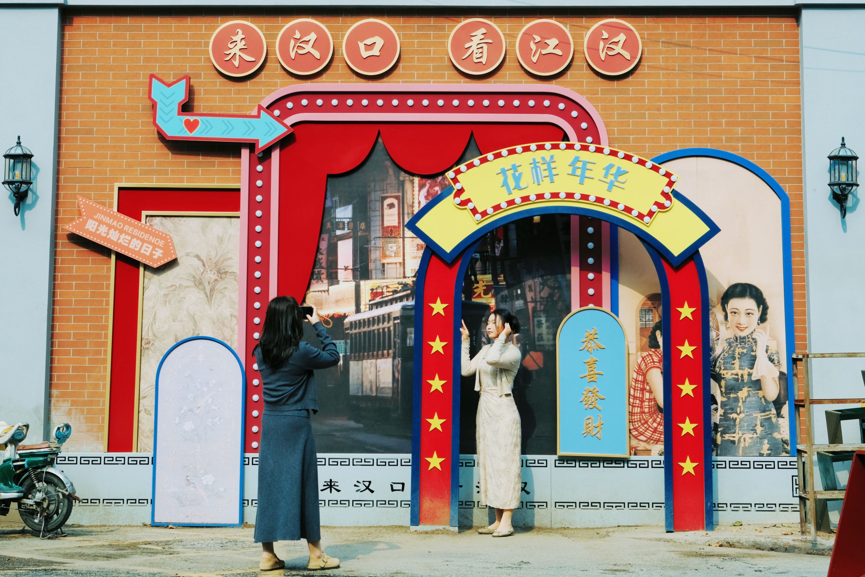 周末市民们来充满老汉口风情的红墙前拍照打卡。