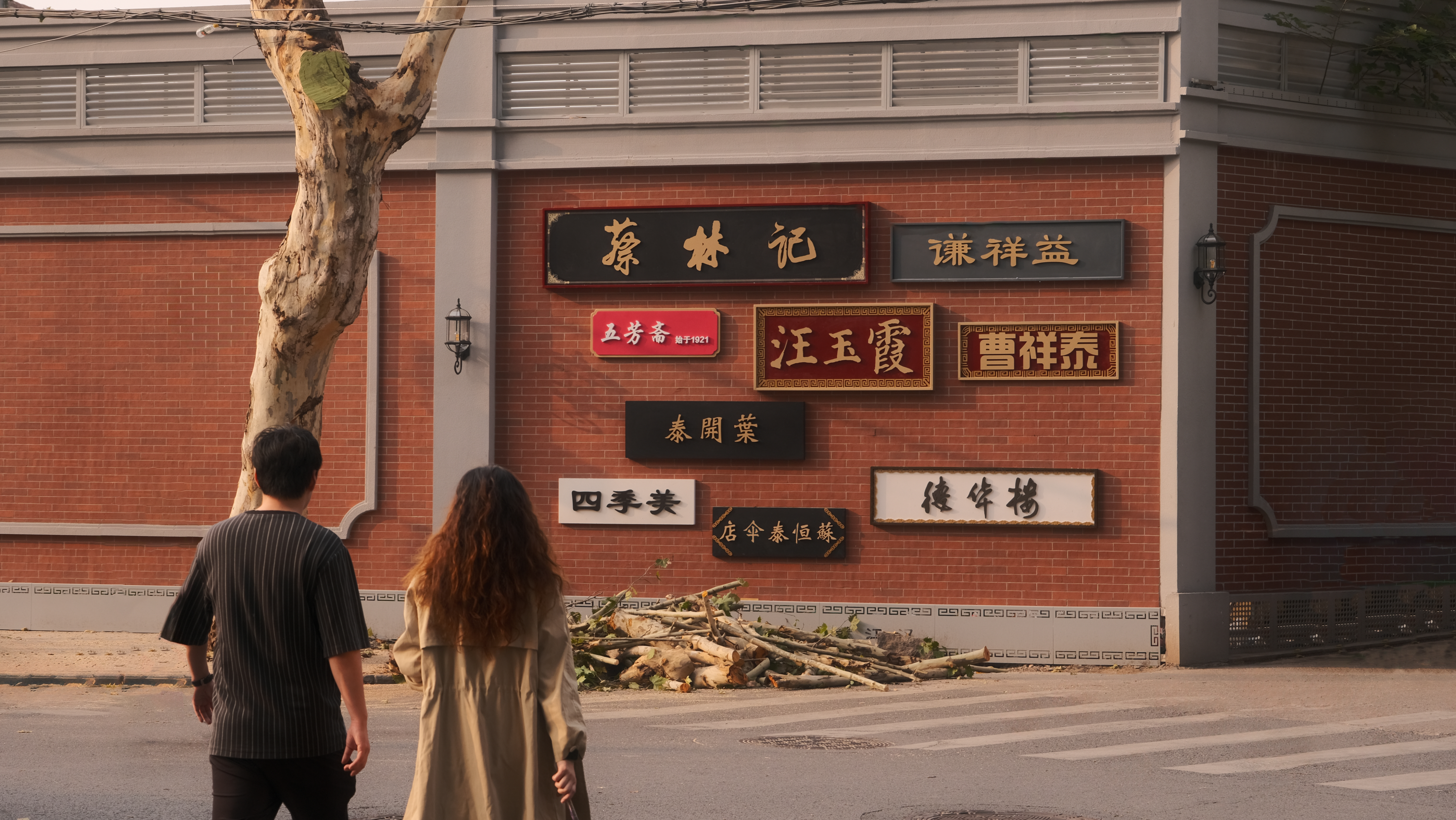 市民路过红墙看老字号招牌。