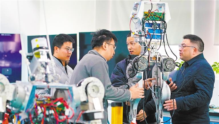 11月28日,武汉格蓝若智能技术股份有限公司实验室,研发团队在进行人形机器人行走调试,这是湖北自主研发的首个站立人形机器人。