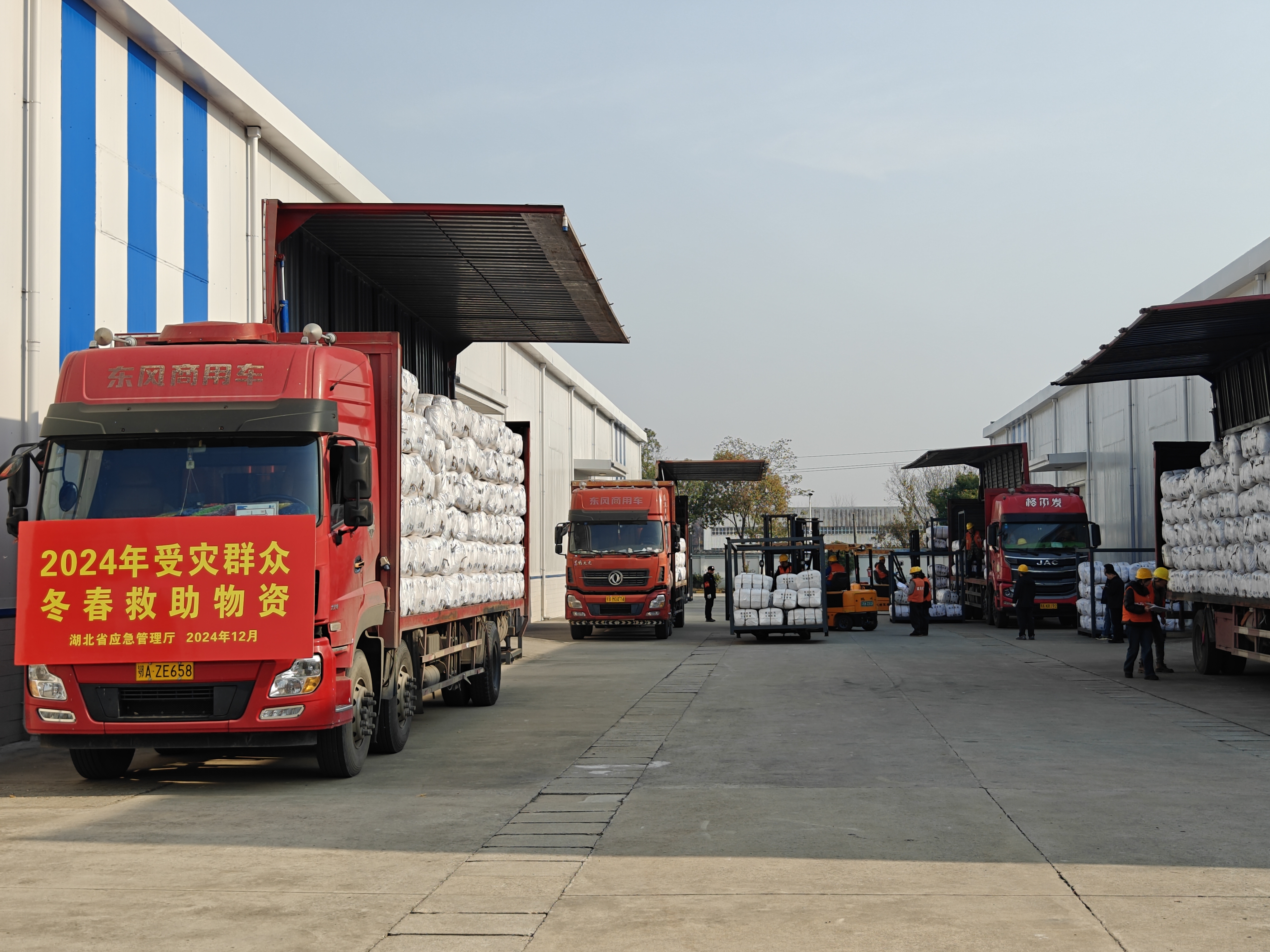 当天天气晴好但气温较低,在武汉救灾物资储备中心库,工人们在湖北省应急管理厅工作人员调度指挥下,将一包包救助物资有序地搬上货运卡车,然后送往受灾群众手中。