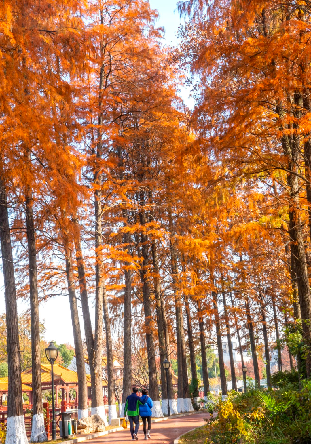 青山公园河边,高大挺拔的水杉树树叶变红,在阳光下闪烁着耀眼的光芒,风轻轻吹过,纷纷扬扬树叶飘落一地,宛如彩色的雨。蜿蜒路道边,潺潺的河水,挺拔高耸的水杉静静伫立,构成了一幅绚丽多彩的画卷。