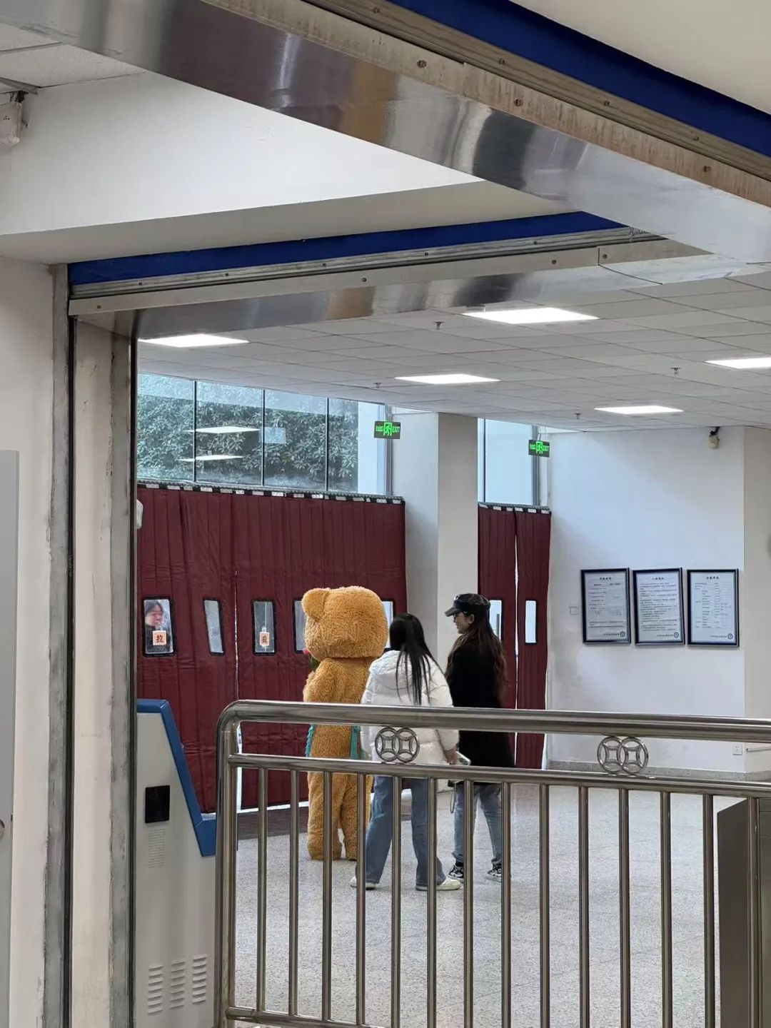 掀开图书馆的门帘,眼前出现的是一幅意外的画面:一只憨态可掬的“熊”与两位同学正守在门口。其中一位同学热情地问我:“想不想和这只熊来个温暖的拥抱?”