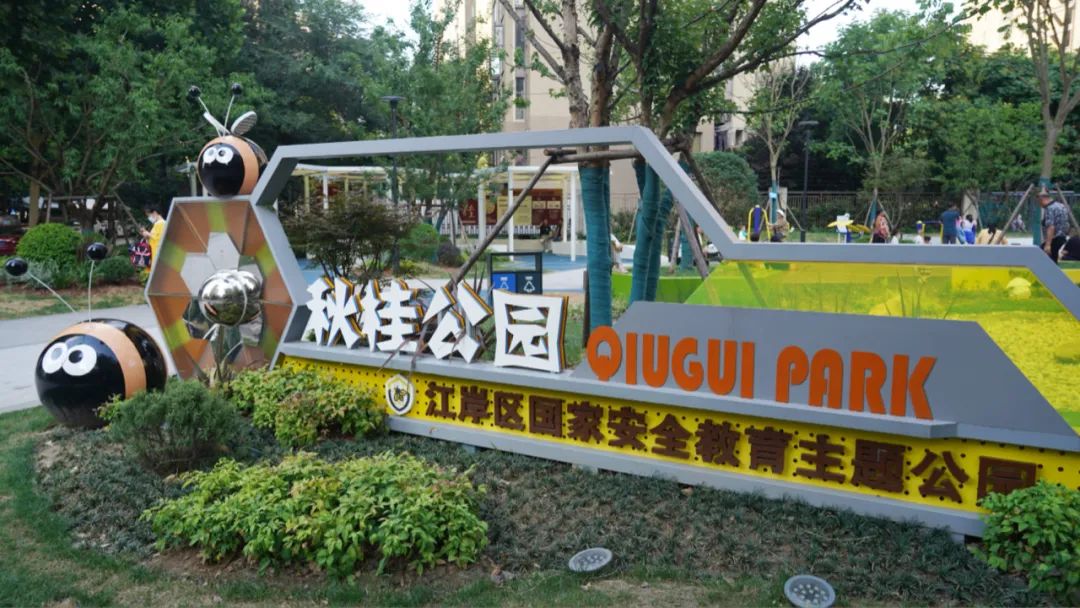 秋桂公园位于江岸区秋桂街与连湖路交会处东南侧,面积约2500平方米。该园既是一座全龄友好社区型口袋公园,又是一座国家安全教育主题口袋公园。
