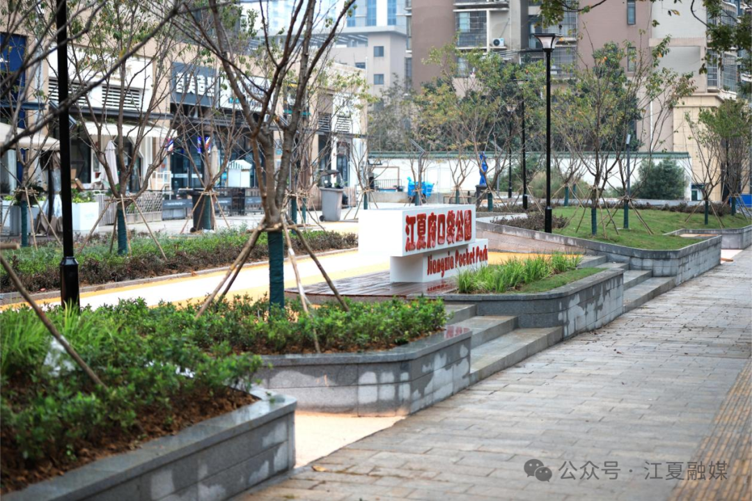 江夏花园口袋公园占地面积1063平方米,将建筑垃圾形成的大土堆改造成一个下沉式口袋公园。