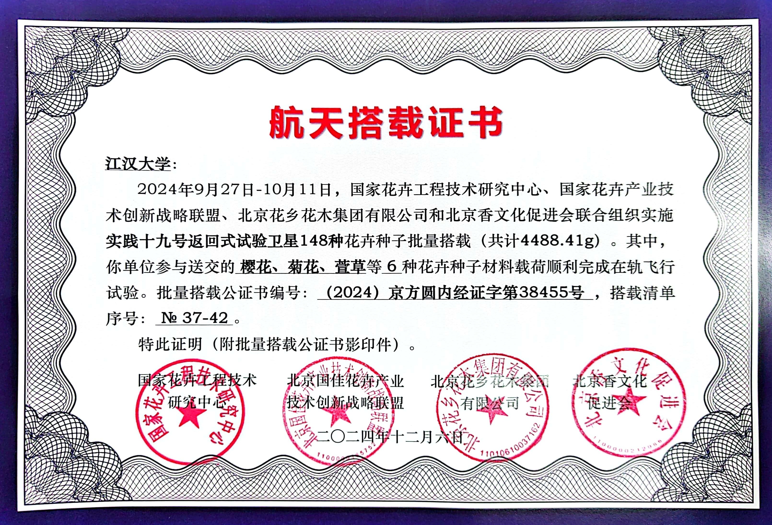 据悉,今年10月11日,由国家花卉工程技术研究中心等单位组织实施的中国实践十九号返回式试验卫星搭载的148种花卉种子(共计4488.41克)完成在轨飞行试验后返回地面,并于12月6日进行了搭载种子交接仪式,其中包括江汉大学科研团队培育的近400克花卉种子。