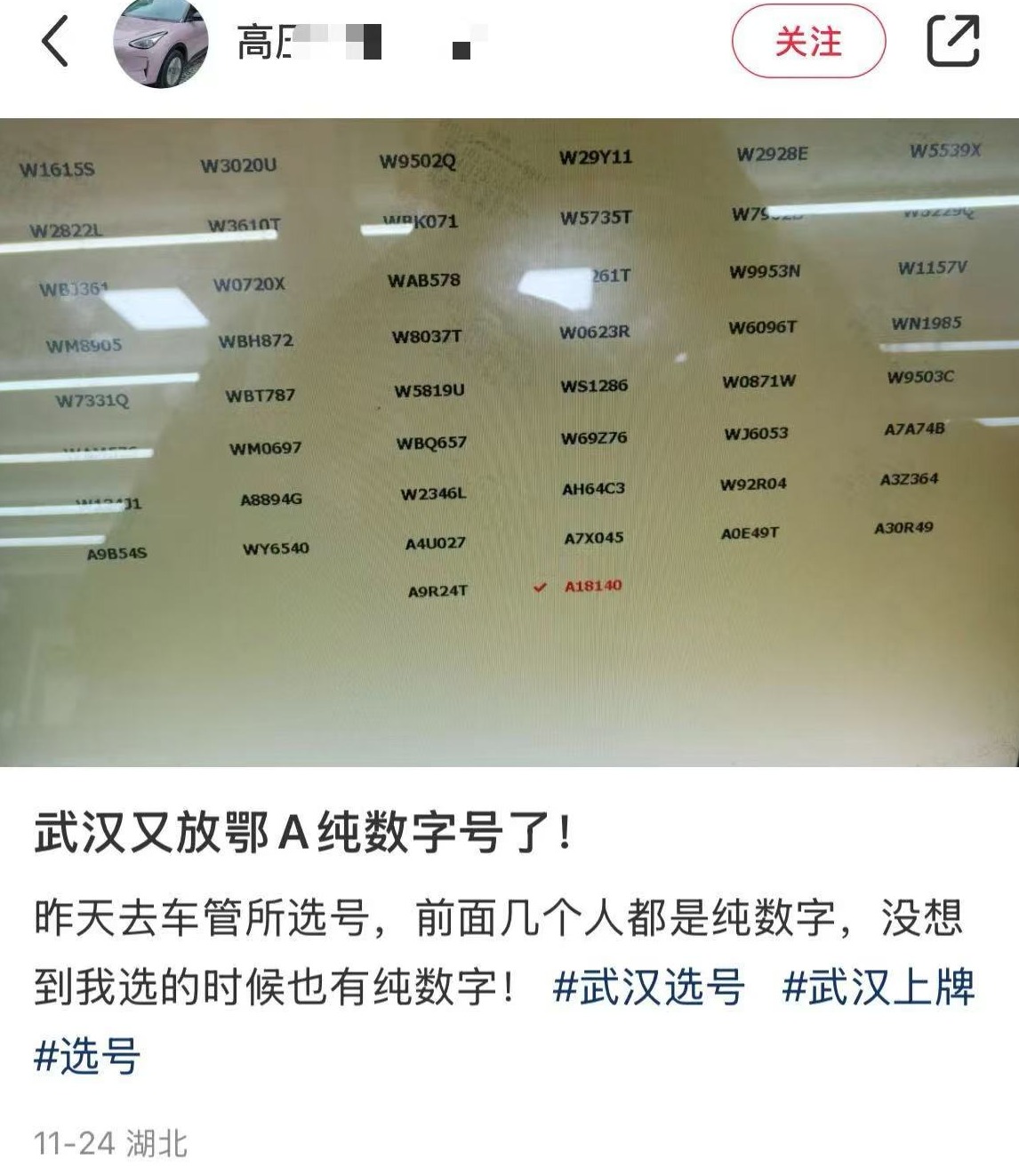 近日,有网友在社交平台上分享的一则选号牌经历引发较大反响。该网友于11月23日在车管所选机动车号牌时,选到了一个鄂A的纯数字号牌。该网友大呼惊讶:“武汉又发放鄂A纯数字号牌了吗?没想到我的选到了!”
