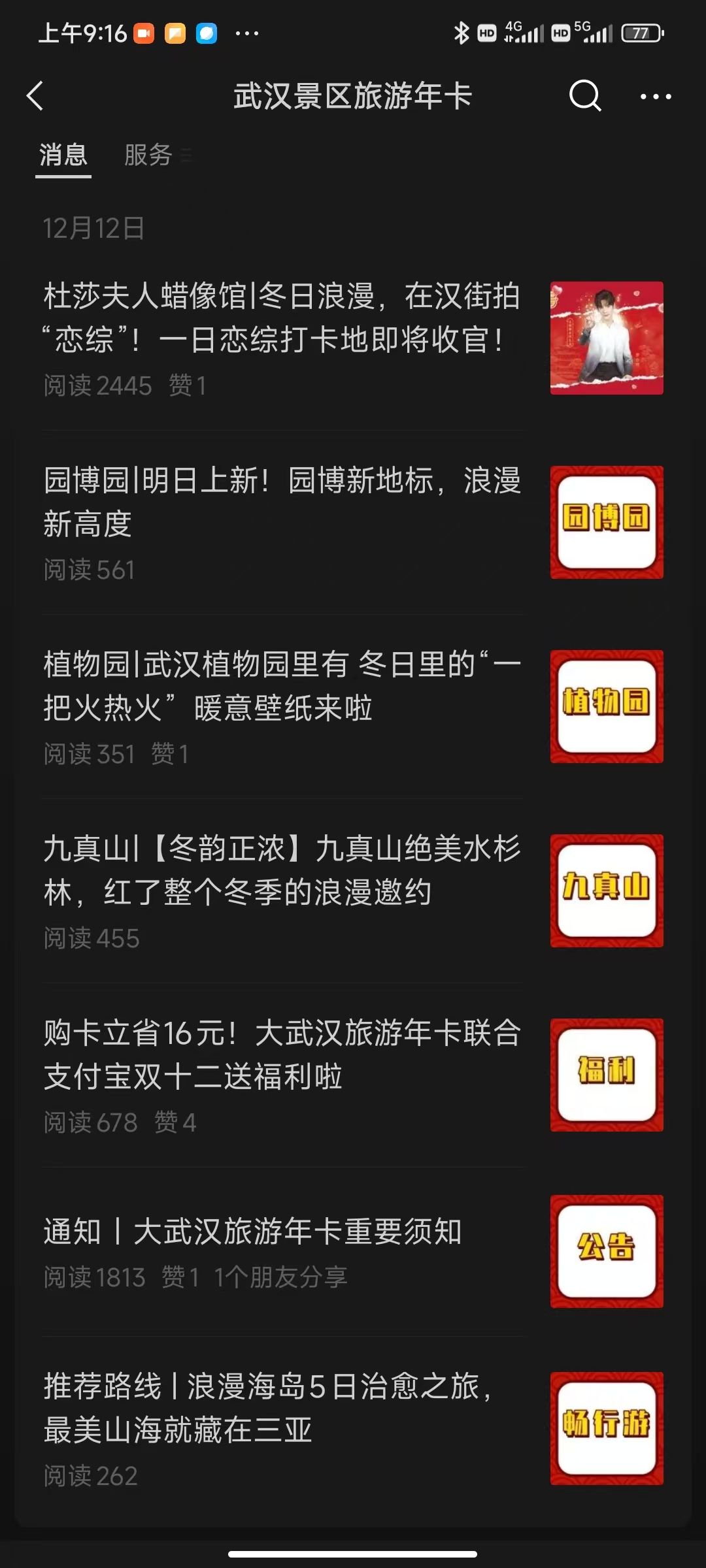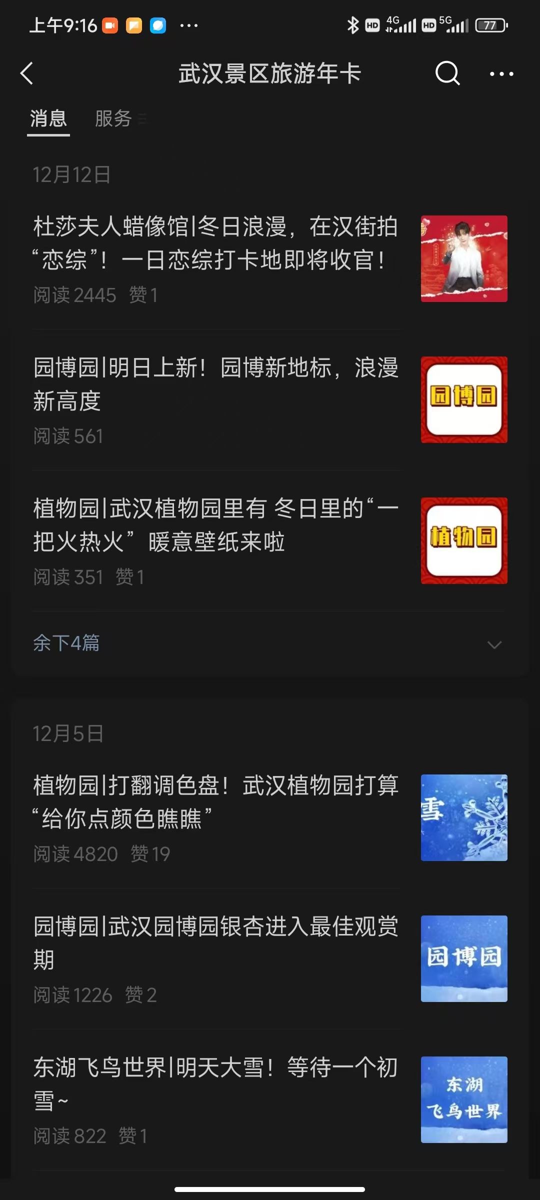 记者注意到,武汉白云黄鹤旅游一卡通管理有限公司官方微信公众号“武汉景区旅游年卡”上,不再续签通知的推文与另外6条推文一同于12月12日下午4点48分发布。通知在倒数第二条,被折叠起来,需要点击“余下4篇”后,才能看到该通知,且“不再续签”等关键字眼并未入标题。