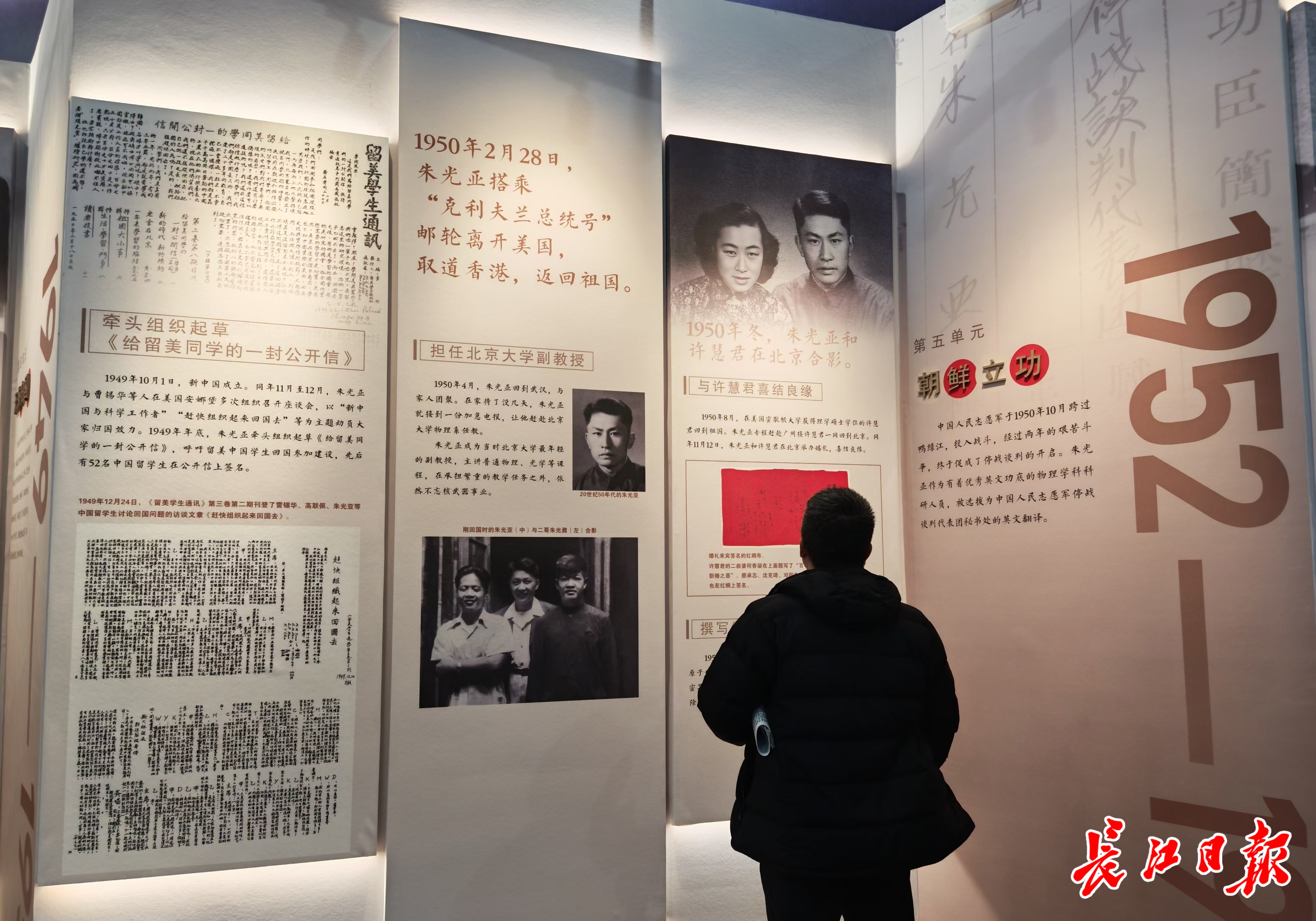 1949年底,在美国留学的武汉学子朱光亚,牵头组织起草了《给留美同学的一封公开信》号召大家回到祖国,引起热烈反响。2个月后,他拒绝了优越的工作条件和物质生活和51名留学生一起回归祖国……展览现场,观众可以翻阅朱光亚公开信的复印件,并从老式录音机中,聆听他号召学子报效祖国的呼唤,感受朱光亚赤子之心和家国情怀。