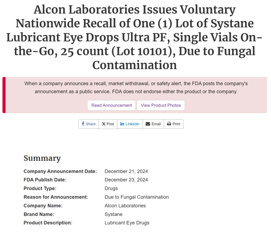 近日,位于美国得克萨斯州沃斯堡市的爱尔康实验室正在主动召回一批眼药水(Systane Lubricant Eye Drops Ultra PF),这批眼药水用于缓解眼睛干涩、刺激等症状。该批次眼药水受到真菌污染,使用或导致失明甚至死亡。