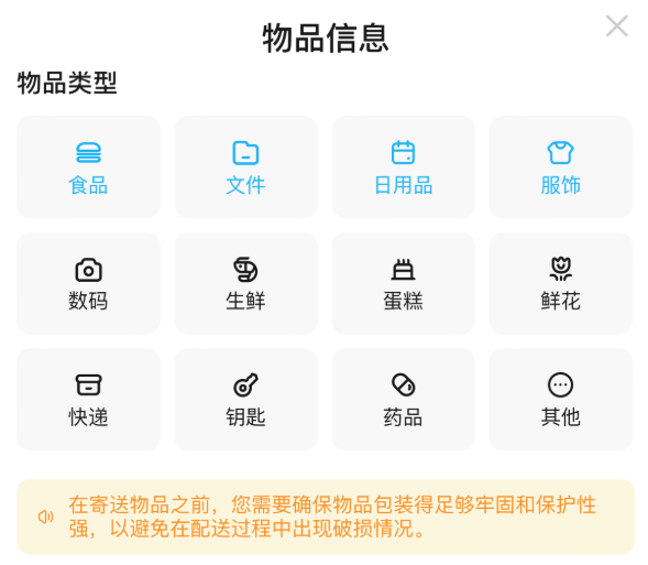 记者在某跑腿平台下单页面看到,可配送物品类型分为12类,具体为:食品、文件、日用品、服饰、数码、生鲜、蛋糕、鲜花、快递、钥匙、药品、其他。这家平台同时提醒:“不建议委托配送实际价值高于5000元的贵重物品;建议使用保价服务;如未使用保价服务,最高赔付金额不超过该笔配送服务费的5倍且最高赔付200元。”