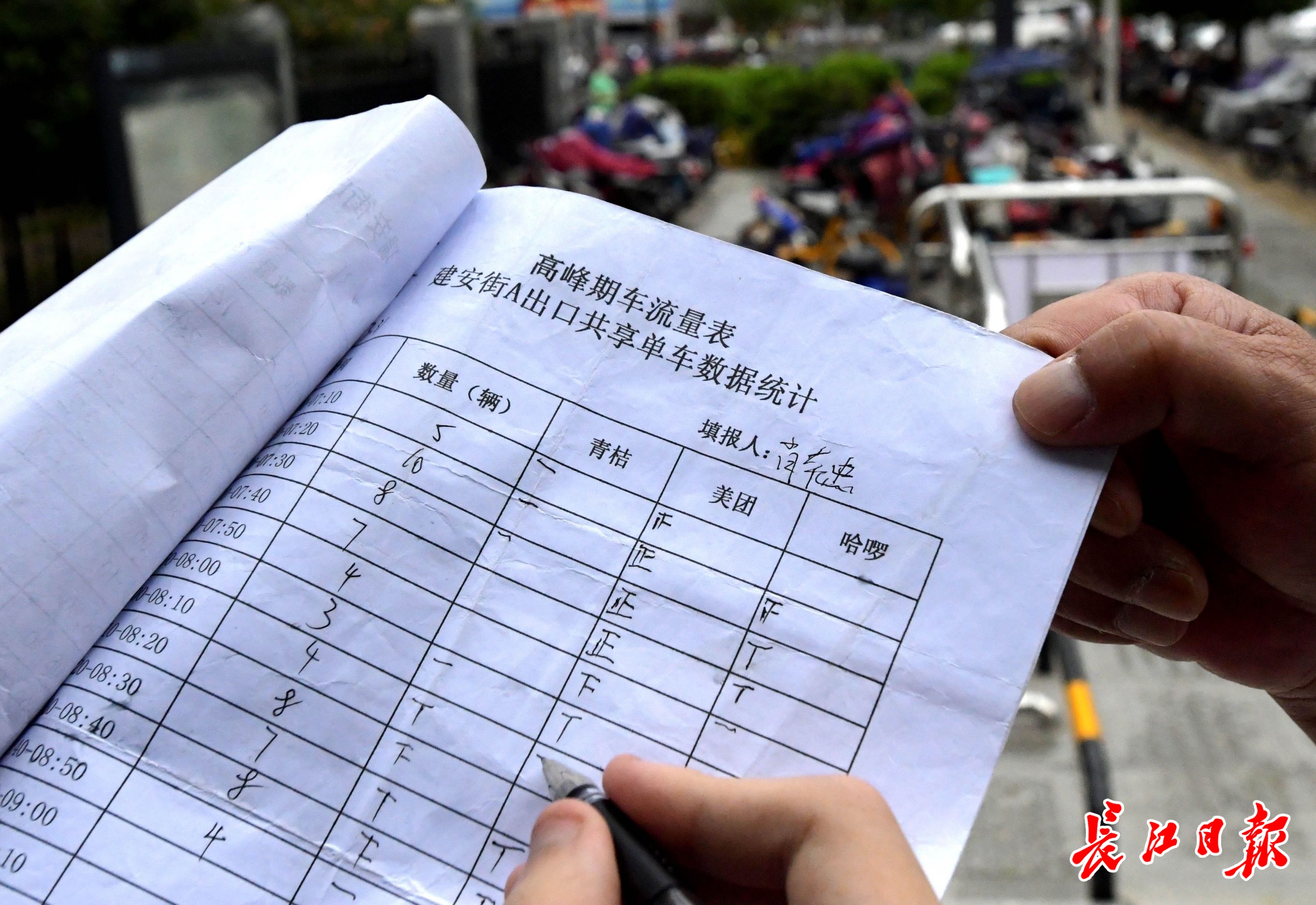 “我用的是笨办法,但是管用。”南湖街综合执法中心城管协管员董传栋告诉记者,4月初,他找来5名队员,人手一张高峰期共享单车数据统计表,在建安街5个地铁口守点。记者看到,4月1日这天的统计表,从早高峰7点到9点、晚高峰5点到7点,10分钟一个时间段,城管队员用划正字的方式,绘制出精准的单车流入图。“我们一共守了7天,单日最高是周一,1391辆车,最低是周日,481辆车。以往高峰期几个地铁口聚集的共享单车超过5000辆,现在我们有一个结论,片区地铁口单车的客户需求峰值,不超过1500辆。”