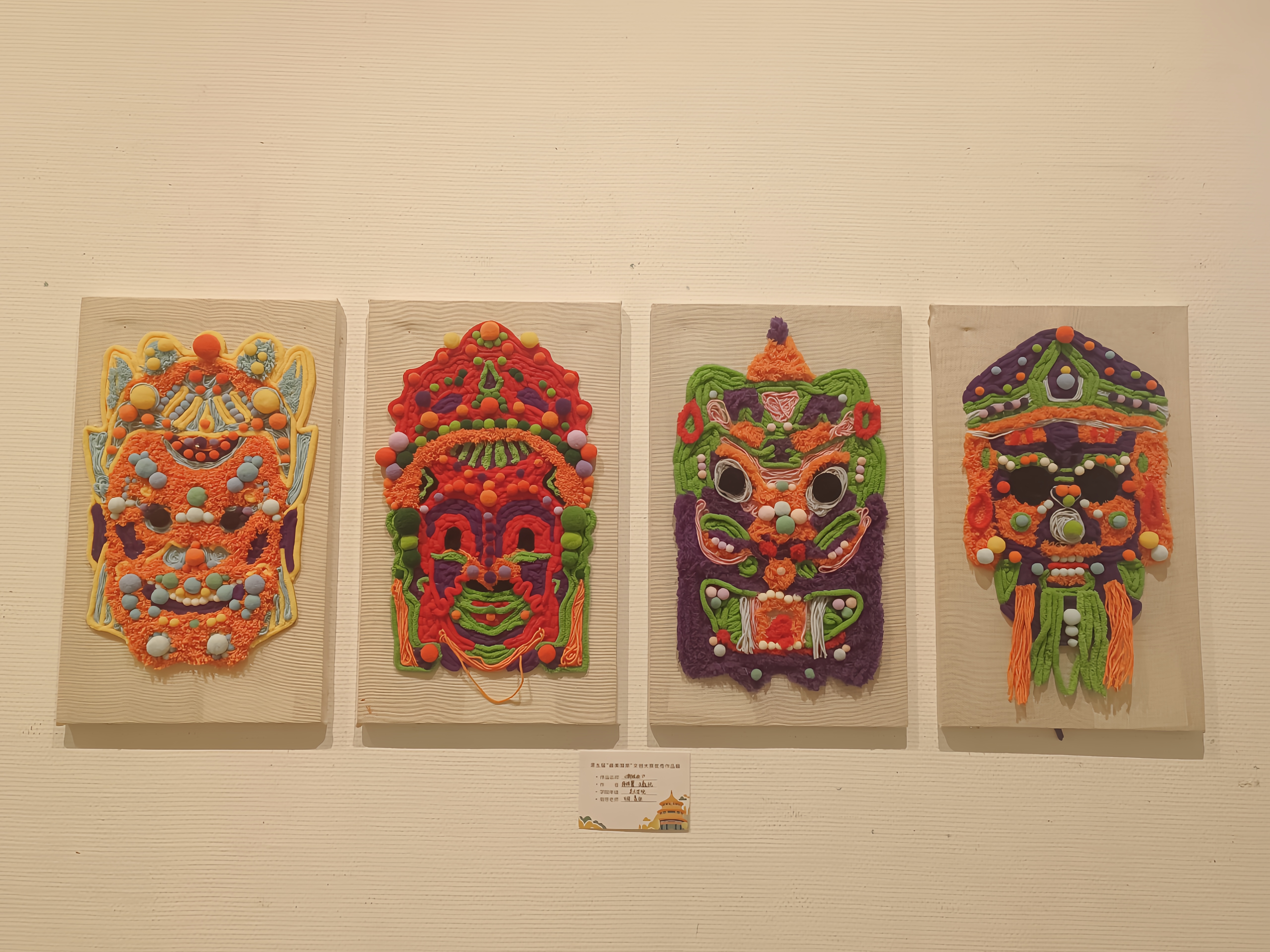 展览现场,一幅名为《新傩面》的作品引人注意。据介绍,设计灵感来自中国传统文化中的傩戏,选取傩戏文将魁星、武将开山猛将和傩公、傩母的面具形象进行视觉再设计,采用不同种类的毛线与毛球,将戳戳绣和拼贴的手法相结合,通过视觉再设计与现代手工技术,形成一个创新、立体、生动逼真的新傩面形象。