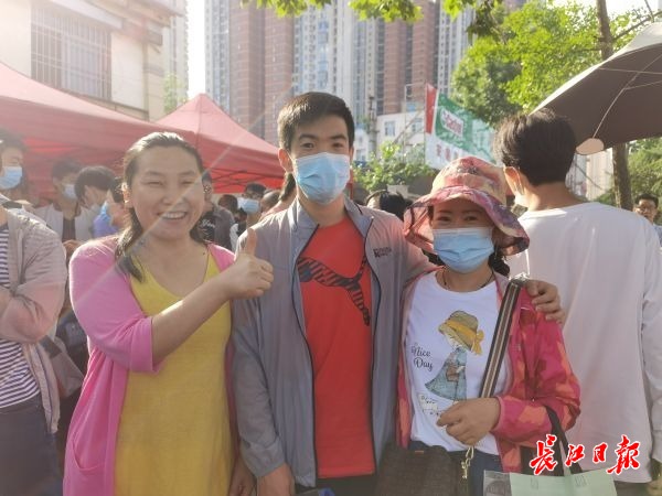 班主任杨桂香(左)、周超(中)和周超的母亲刘秀娟(右)在考点门前合影留念。 长江日报记者郭丽霞 摄